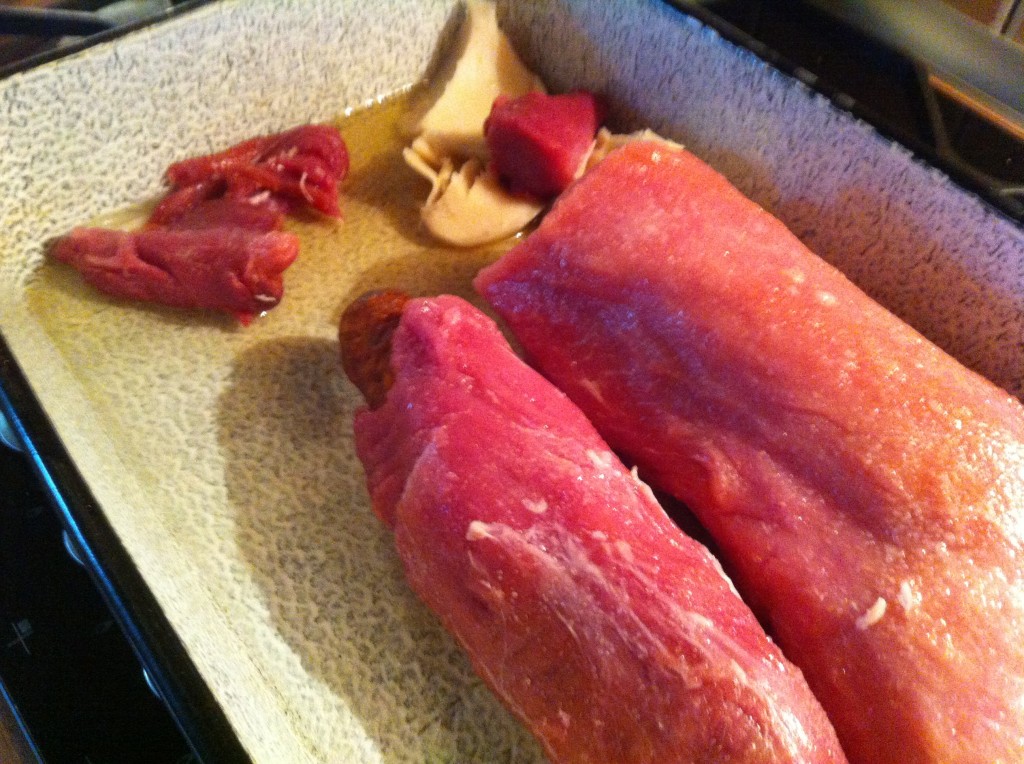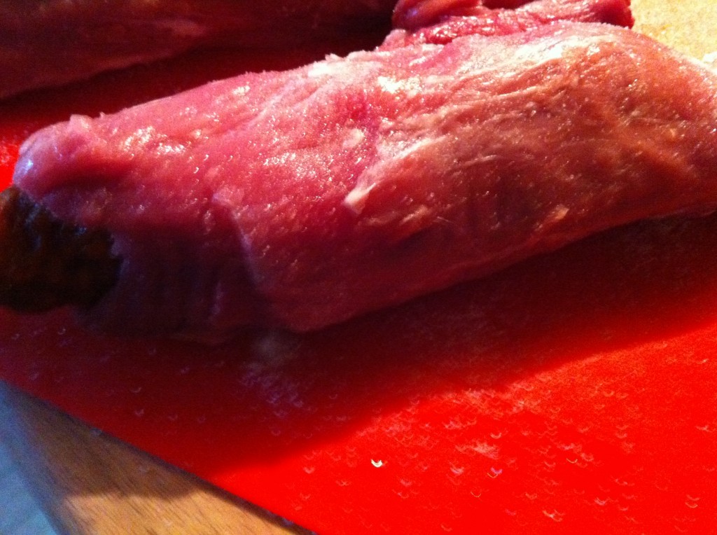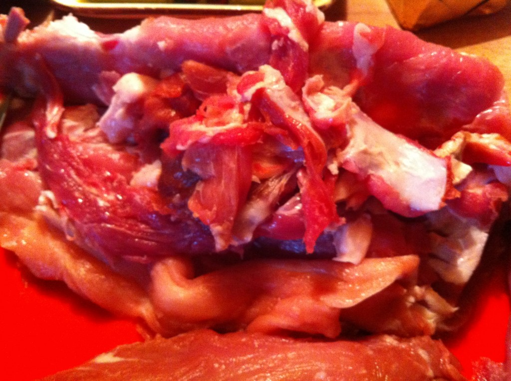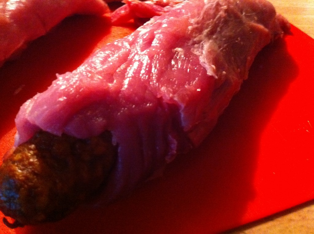 A krumplit feltesszük főni.A hús kicsontozzuk, tisztítjuk, szeleteljük. (Lehet ún. nyitott szeleteket is csinálni, így nagyobb szeleteket kapunk. Ilyenkor egy szeletnyi a húst bevágunk, de nem vágjuk teljesen át, majd a második szeletnyi vágjuk le. A kapott hússzeletet kinyitjukés klopfoljuk - lásd a képeken). Besózzuk és egy 20 percet állni haggyuk. A megfőtt krumplit -lehetőleg melegen- meghámozzuk. Két darabot összetörünk villával. (Ez sűríti majd be a salátalevünket.) A hagymát apróra vágjuk, a mustárt az olajjal kikeverjük (apránként adjuk hozzá az olajat, mert kicsapódhat!), hozzáöntjuk az almaecetet, a hagymát és belekeverjük az összetört krumplit. Rákarikázzuk a főtt krumplit, majd forró alaplével, csontlével (vagy kocskából főzünk egy levest, ha más nincs) felöntjük, utána óvatosan elkeverjük, kóstóljuk, ha kell utána ízesítünk - és állni haggyuk. Ha kihűlt, hűtőben tovább hagyhatjuk érlelődni.