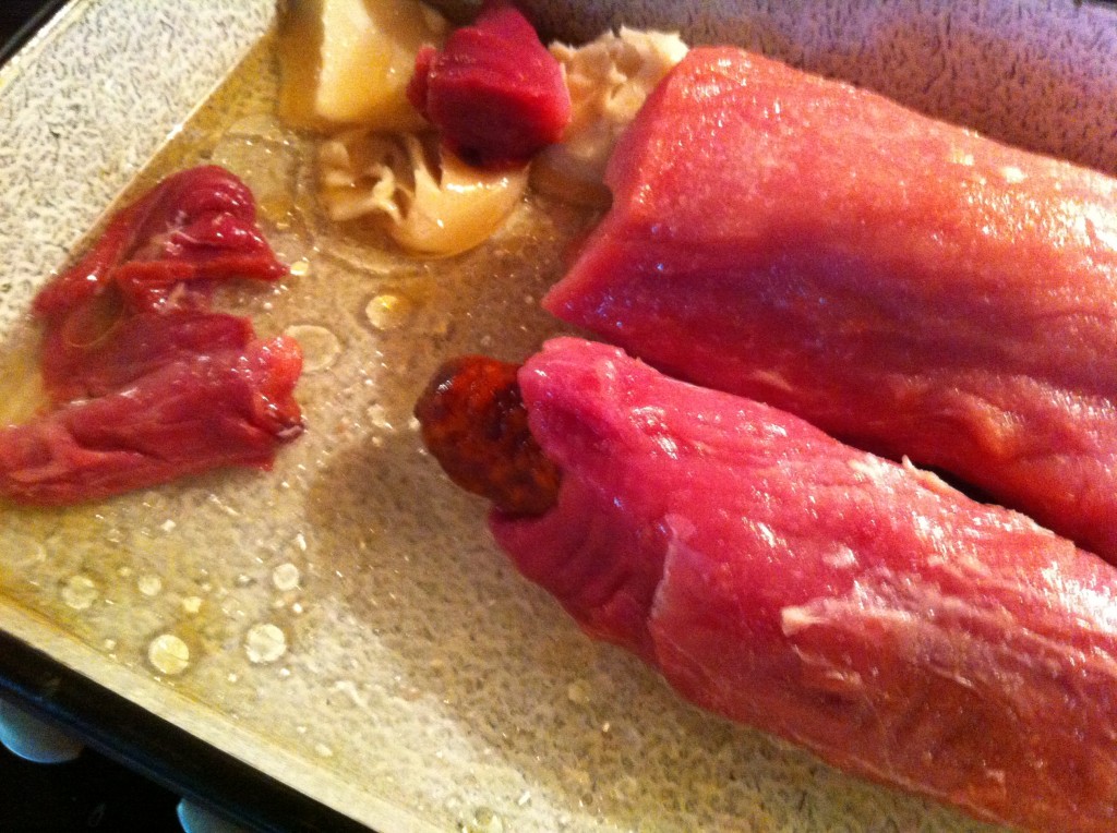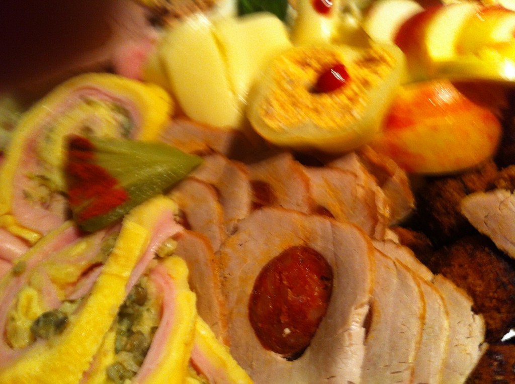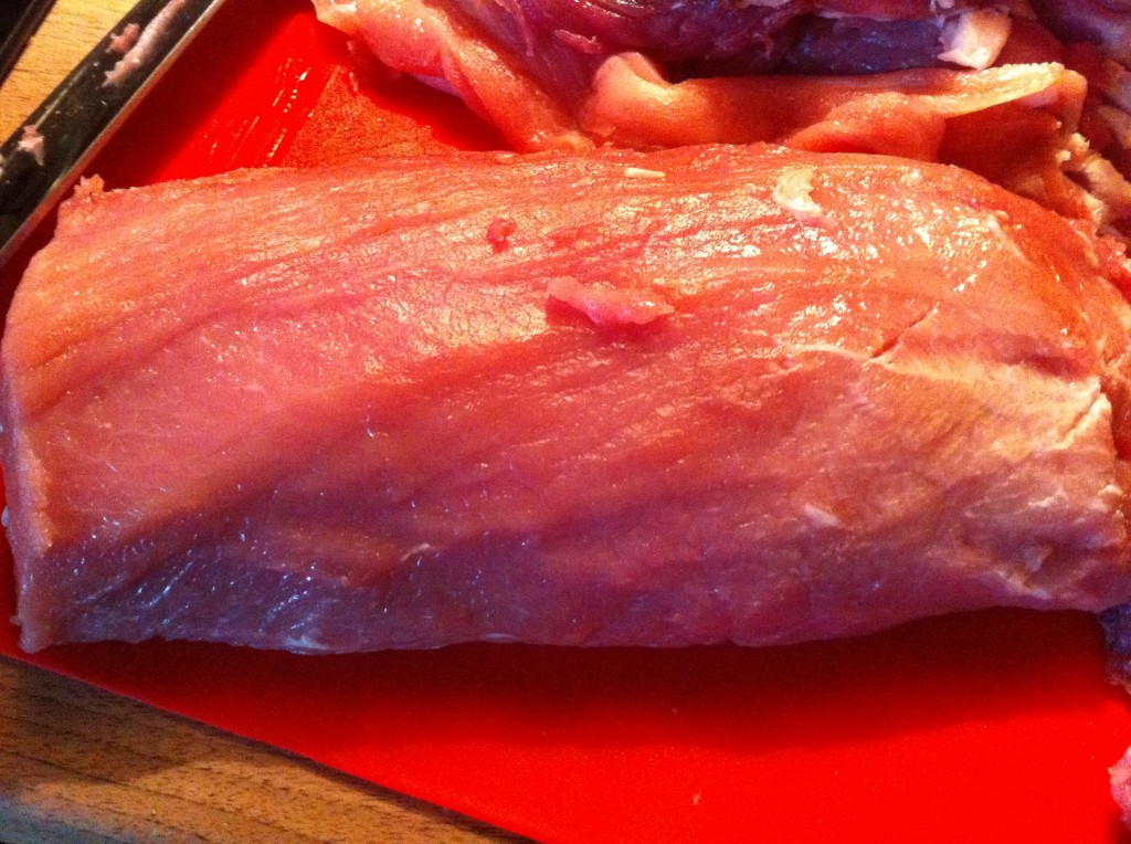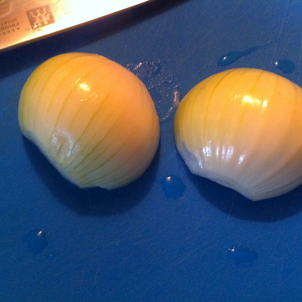 A krumplit feltesszük főni.A hús kicsontozzuk, tisztítjuk, szeleteljük. (Lehet ún. nyitott szeleteket is csinálni, így nagyobb szeleteket kapunk. Ilyenkor egy szeletnyi a húst bevágunk, de nem vágjuk teljesen át, majd a második szeletnyi vágjuk le. A kapott hússzeletet kinyitjukés klopfoljuk - lásd a képeken). Besózzuk és egy 20 percet állni haggyuk. A megfőtt krumplit -lehetőleg melegen- meghámozzuk. Két darabot összetörünk villával. (Ez sűríti majd be a salátalevünket.) A hagymát apróra vágjuk, a mustárt az olajjal kikeverjük (apránként adjuk hozzá az olajat, mert kicsapódhat!), hozzáöntjuk az almaecetet, a hagymát és belekeverjük az összetört krumplit. Rákarikázzuk a főtt krumplit, majd forró alaplével, csontlével (vagy kocskából főzünk egy levest, ha más nincs) felöntjük, utána óvatosan elkeverjük, kóstóljuk, ha kell utána ízesítünk - és állni haggyuk. Ha kihűlt, hűtőben tovább hagyhatjuk érlelődni.