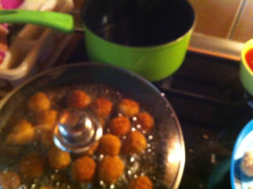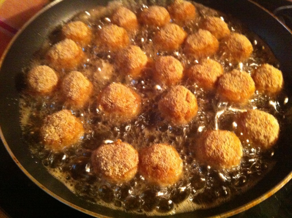 A húst bepanírozzuk és közepes lángon kisütjük. (Én az első felét fedő alatt, a másikat fedő nélkül sütöm, amíg aranybarna lesz.)