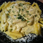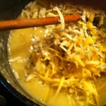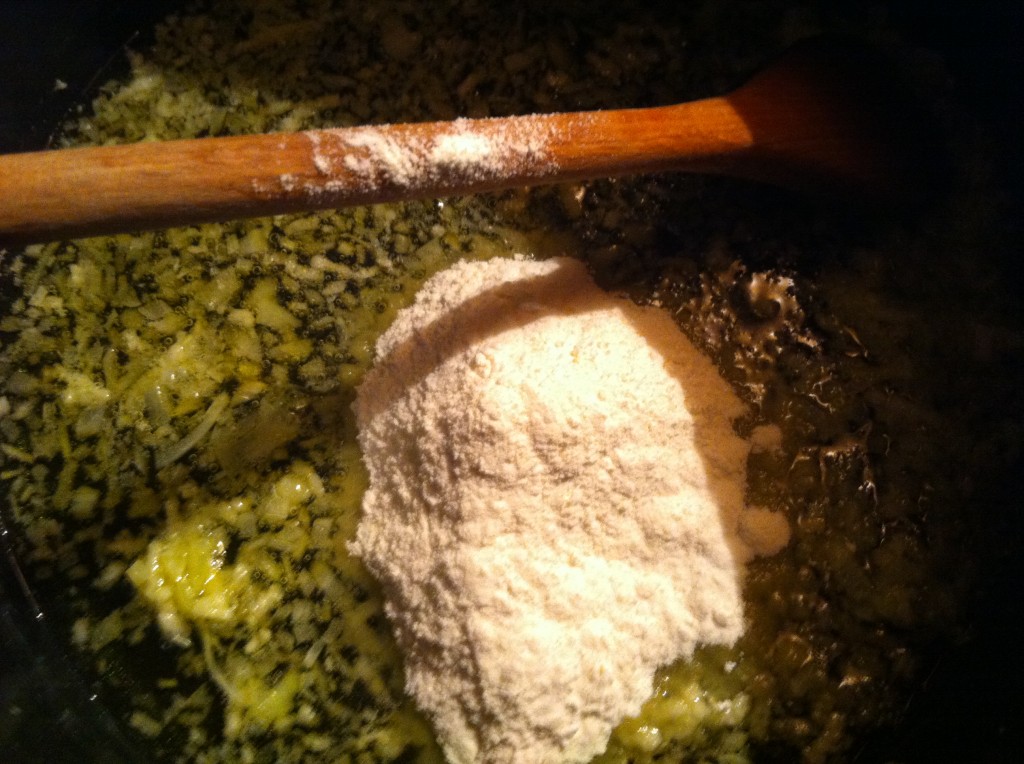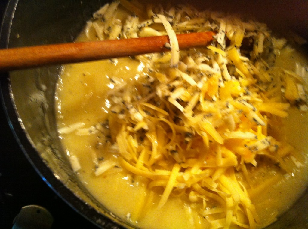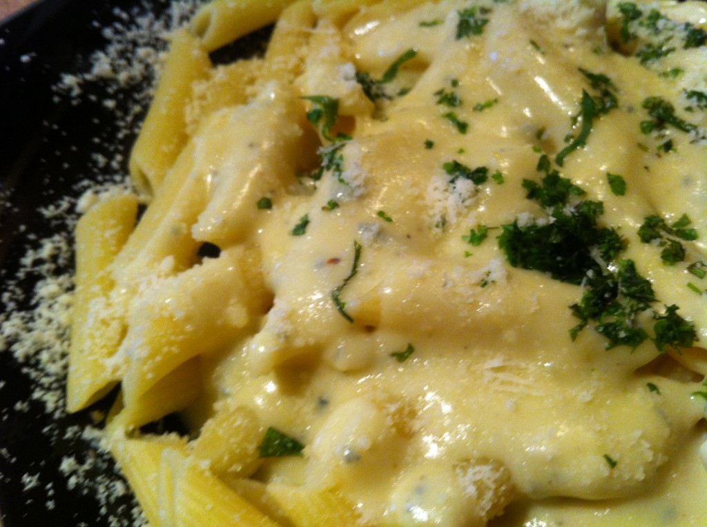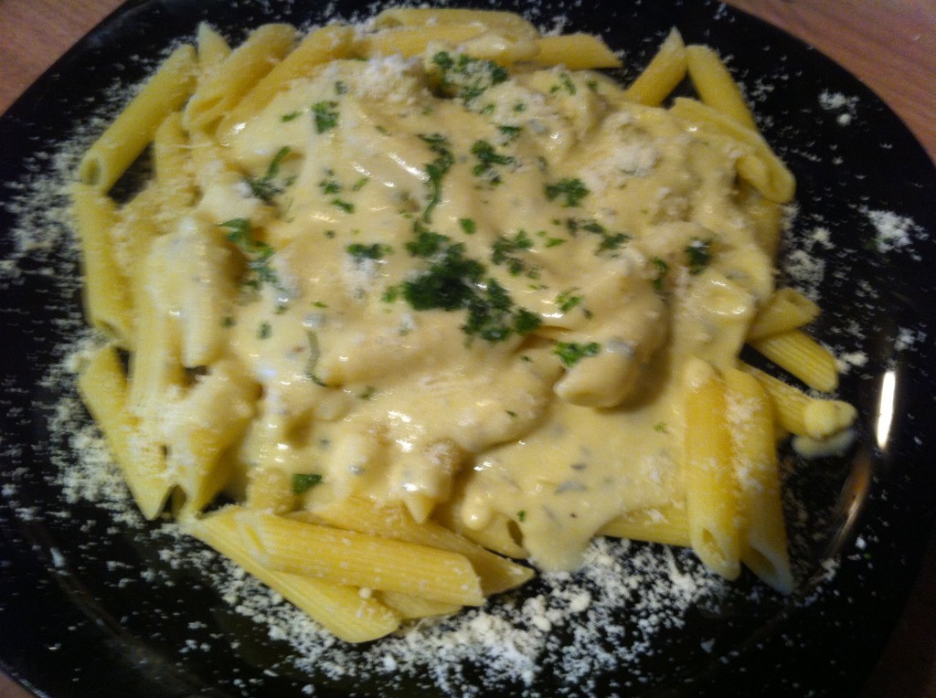 A vizet felteszem főni a tésztának. Az olívaolajon meghúzom a hagymát (2 perc), belezúzom a fokhagymát és leszórom a liszttel. Simára keverem, beleöntöm az alaplevet vagy vizet (nekem fagyasztva volt az alaplé). Víz esetén mehet bele egy fél/harmad erőleveskocka. Frissen őrölt bors és só, beleszórom a lereszelt, darabolt sajtokat, majd felöntöm egy kis tejjel (ha van tejszín, még jobb!). Összefőzöm. A tészta leszűrése előtt egy kevés főzőlevet belekeverek még a szószba és tálalom. Tálaláskor meghintem parmezánnal, frissen metélt oregánóval és petrezselyemmel.