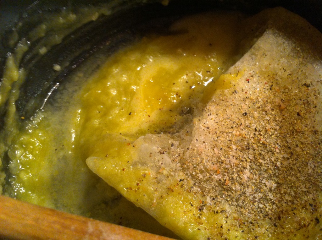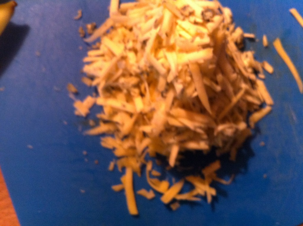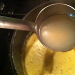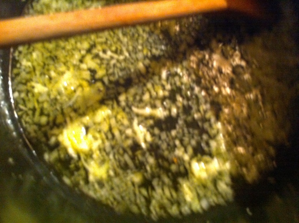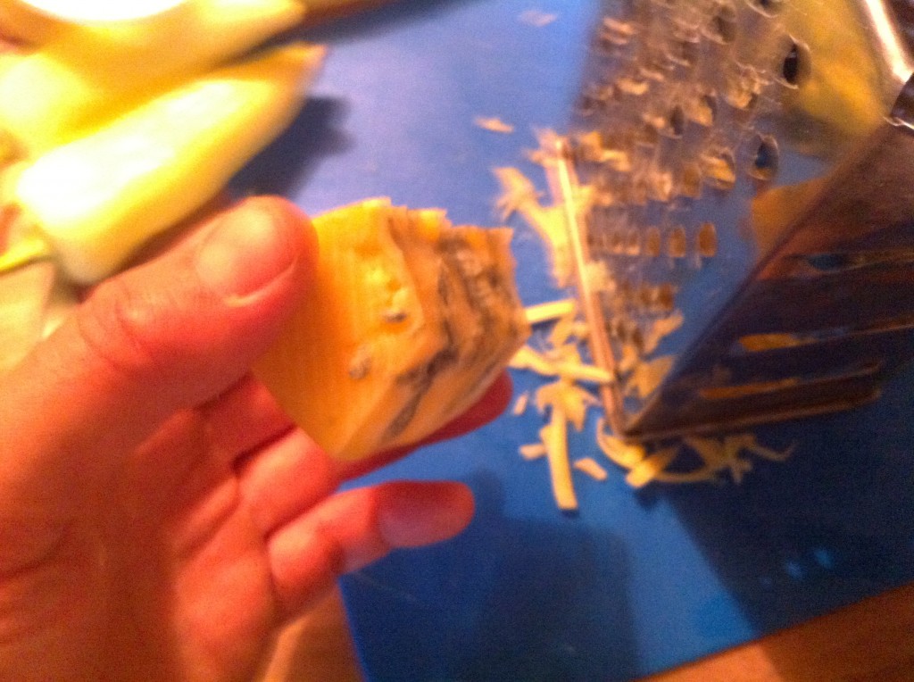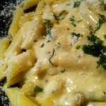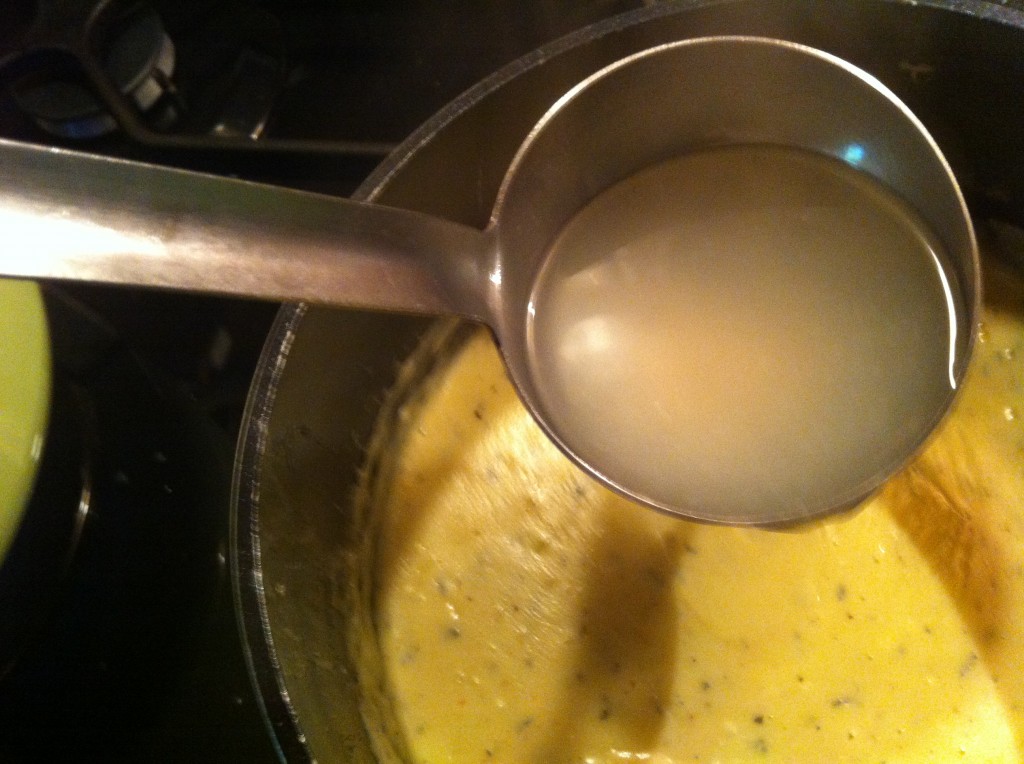 A vizet felteszem főni a tésztának. Az olívaolajon meghúzom a hagymát (2 perc), belezúzom a fokhagymát és leszórom a liszttel. Simára keverem, beleöntöm az alaplevet vagy vizet (nekem fagyasztva volt az alaplé). Víz esetén mehet bele egy fél/harmad erőleveskocka. Frissen őrölt bors és só, beleszórom a lereszelt, darabolt sajtokat, majd felöntöm egy kis tejjel (ha van tejszín, még jobb!). Összefőzöm. A tészta leszűrése előtt egy kevés főzőlevet belekeverek még a szószba és tálalom. Tálaláskor meghintem parmezánnal, frissen metélt oregánóval és petrezselyemmel.