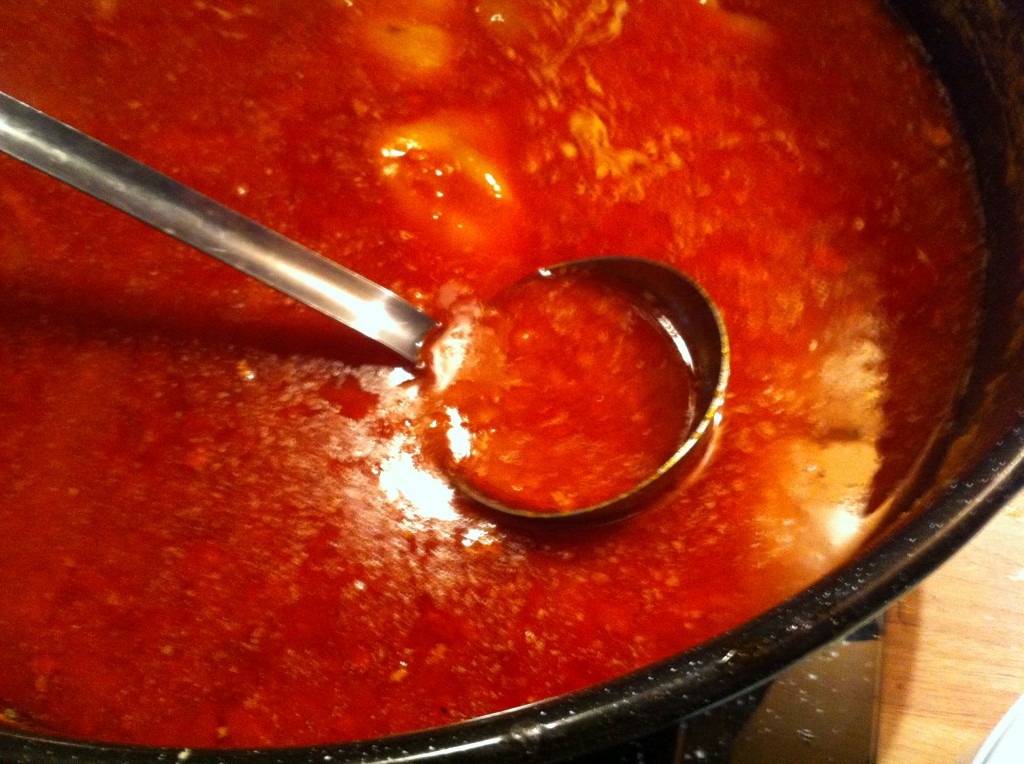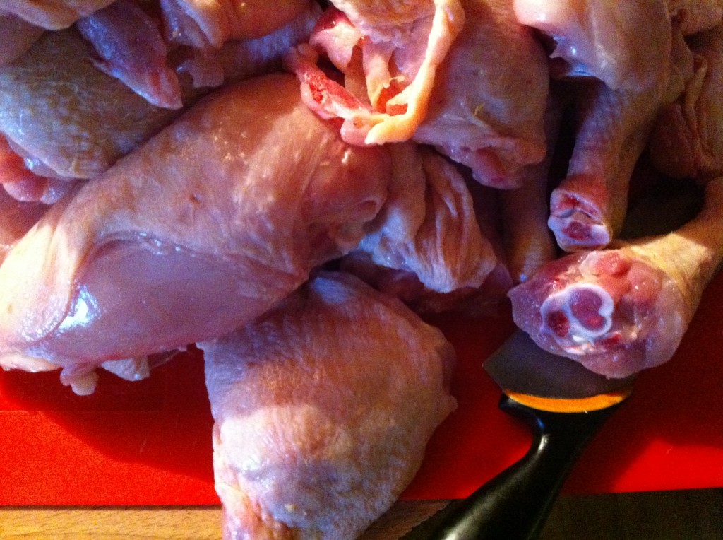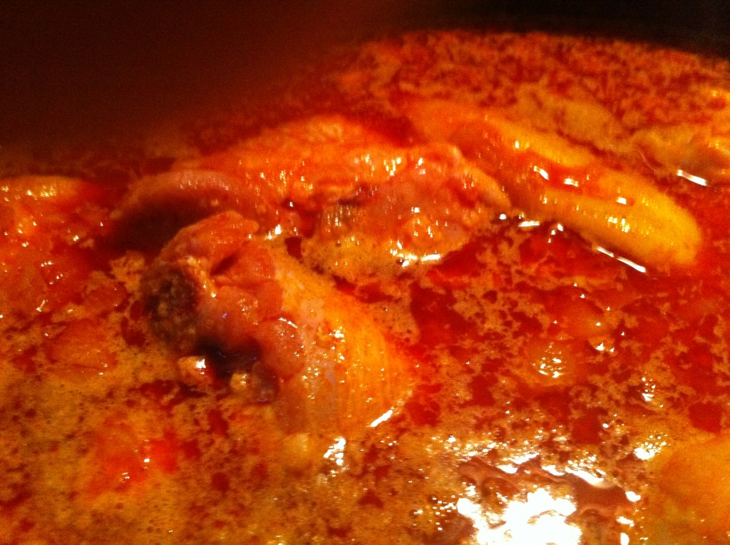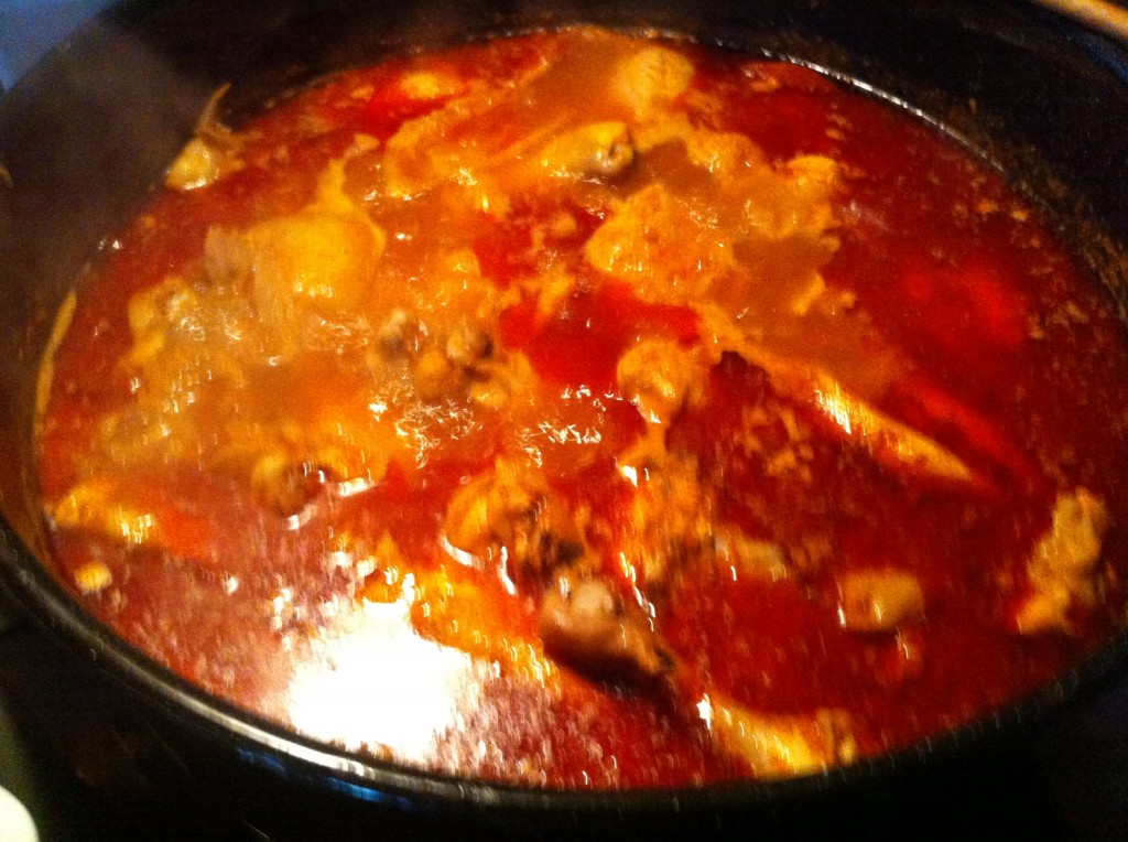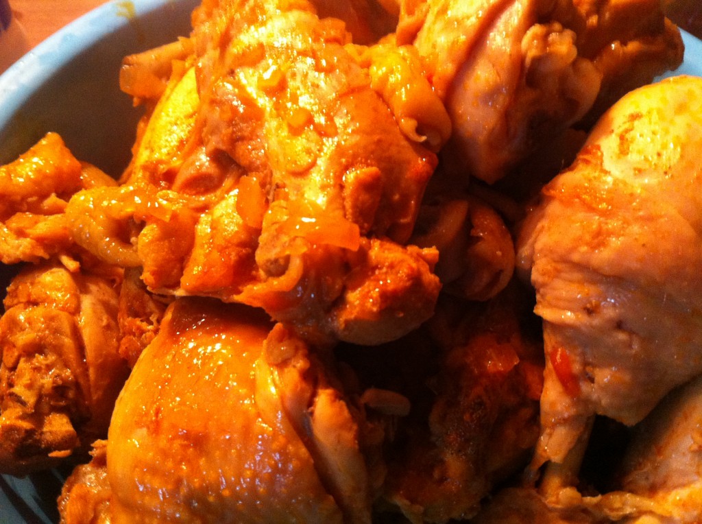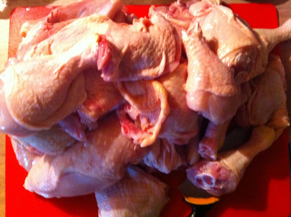 A hagymát felaprítjuk, a csirkemellet ketté vágjuk (csontosan), az egész combot is felezzük (alsó, felső). A hagymát zsíron megpirítjuk, beledobjuk a kicsumázott paprikát, paradicsomot, leszórjuk fűszerpaprikával és gyorsan elkeverjük. Felöntjuk egy kis vízzel, beletesszük a csirkmelleket, csirkecombokat, hozzáadjuk az alaplevet és felöntjuk annyi vízzel, hogy ellepje. Enyhén sózzuk, borsozzuk. Amikor már fő egy ideje, megkostoljuk, szükség szerint utána fűszerezzük. Én enyhén sósra szoktam főzni, mert a végén még megy bele a habarás is, de kezdőbb szakácsoknak javasolt a legeslegvégén utána fűszerezni, nehogy elsózzuk.