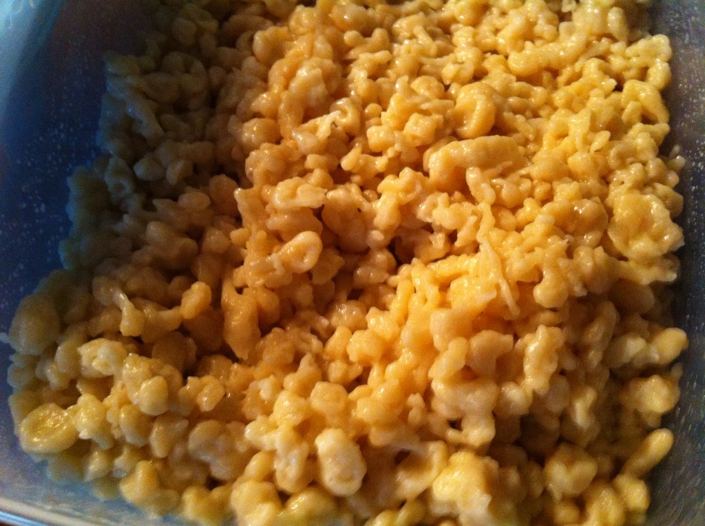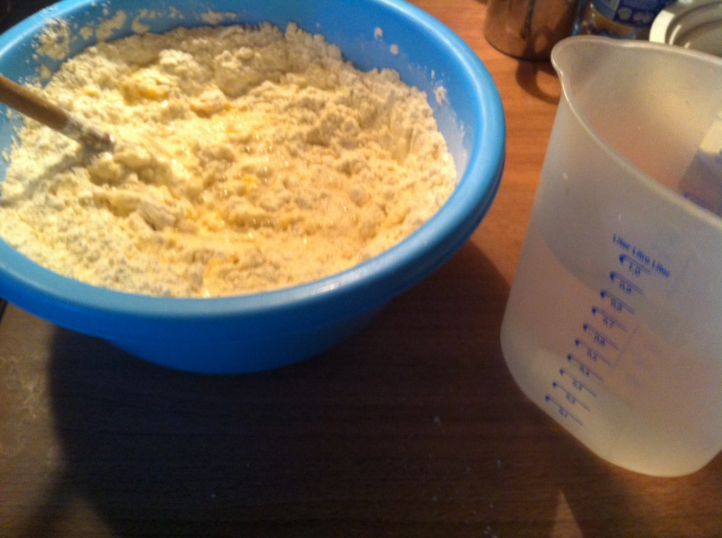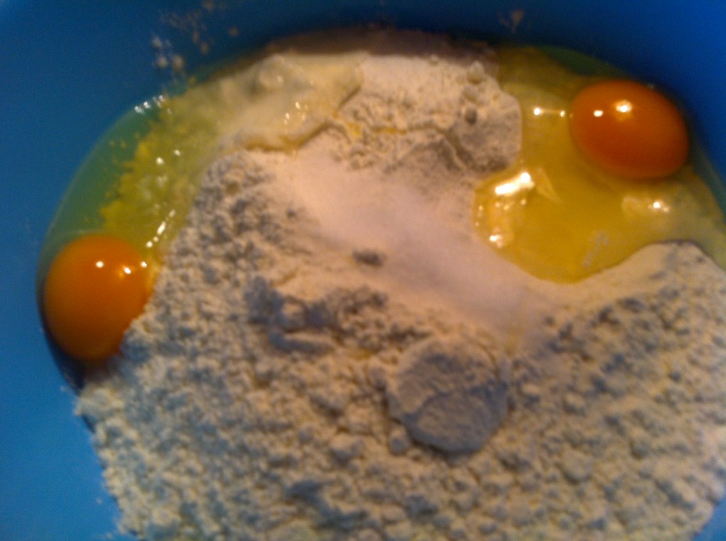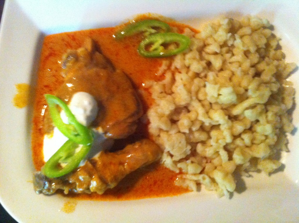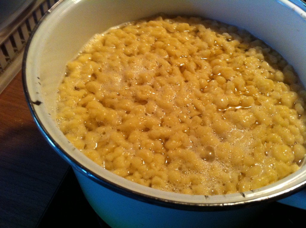 Amíg fő, elkészítjuk a nokedlit. A lisztet összekeverjük a sóval és tojással, majd hozzáadagoljuk a vizet és simára keverjük.Lbogó, enyhén sós vízbe kifőzzük a nokkedlit.