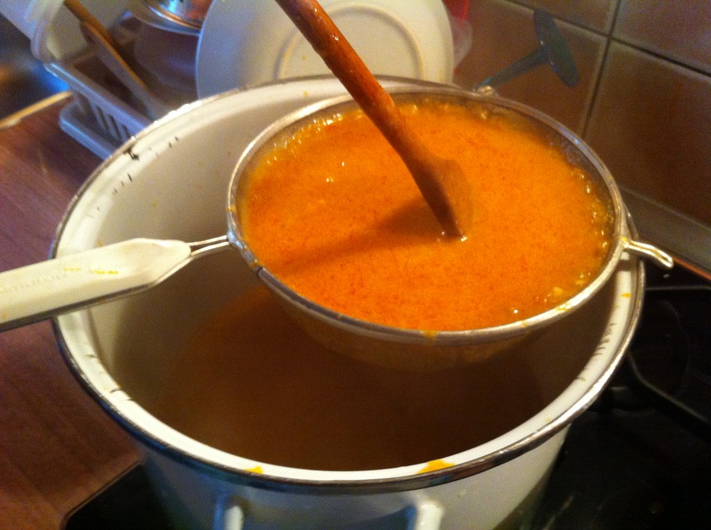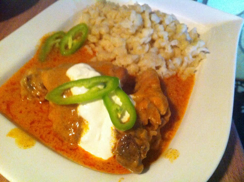 Ha megfőtt a hűs, akkor kiszedjük (óvatosan, ne essen szét!), majd a visszamaradt forró léből merőkanalanként adagolva felhigítjuk a tejfölös-lisztes habarást (hőkiegyenlítés - ha nem így csináljuk, akkor a tejföl kicsapódik és igen furcsán fog kinézni az étel) Amikor már elég forró levet kanalaztunk a habarásba (érezzük, hogy meleg a tál), akkor az egészet visszaöntjük a maradék forró léhez. Gyorsan elkeverjük (ha valakinek kicsit becsomósodna, ne ijedjen meg, úgyis átszűrjük szitán) és kiforraljuk. Ha kicsit hígabb, nem kell megijedni, az átszűrés után is sűrüsödik, illetve másnapra még sűrübb lesz. Egy kislyukú szitán, szűrőn átszűrjük. Fakanállal lehet kicsit paszírozni is (én szoktam). Amikor kész, a még forró csirkét visszarakjuk az átszűrt/paszírozott forró szaftba. Forrón tálaljuk friss tejföllel locsolva. Arra figyeljünk, hogy tejfölös, lisztes ételről van szó, ami könnyen romlik. Ha nem fogy el egy-két nap alatt, csináljunk belőle hortobágyi palacsintát.