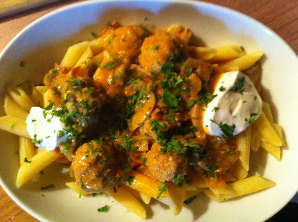 A húsgombócot összekeverjük a hozzávalókkal és a hűtőbe tesszük. A tésztának felteszzük a vizet főni. A hagymát felaprítjuk és zsíron a füstöltszalonnável és füstölt sonkával/császár szalonnával megpirítjuk. Leszórjuk pirosparikával, beledobjuk a parikát, paradicsomot, kis vizet teszünk rá, hogy a paprika le ne égjen, beleszórjuk a felkarikázott gombát és lassú tűzön fél készre főzzük. Amíg fő a darálthúsból húsgombócokat készítünk és beletesszük a "bakonyi" alapba. Ha nem lepi el a lé, kicsit engedjuk fel alaplével vagy vízzel. Ha már kicsit összefőtt, kóstoljuk -ha kell- ízesítjük. Ha a gombócok megfőttek, a tejfölt kikeverjük a liszttel csomómentesre, majd a forró "bakonyiból" többször óvatosan hozzámerünk és simára keverjük (hőkiegyenlítés). Ha már elég meleg a tejföl, akkor beleöntjük a "bakonyiba" és óvat osan elkeverjük. Kiforraljuk és azonnal tálaljuk.