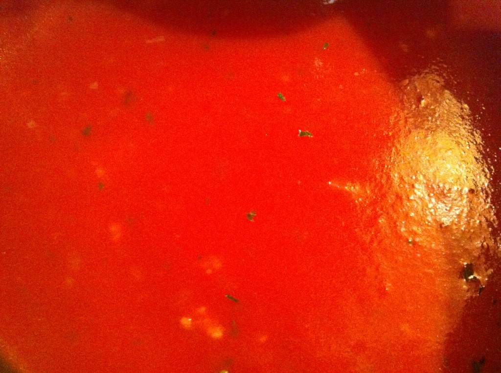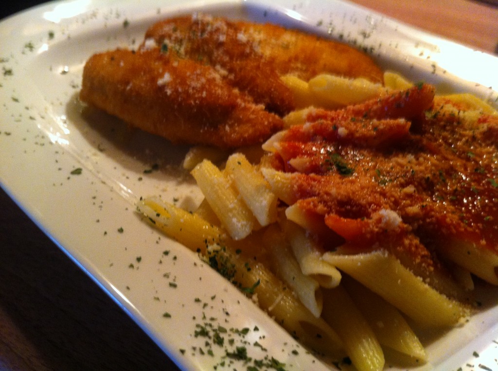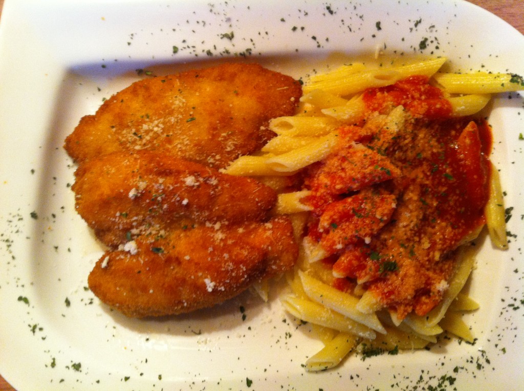A tésztát felteszem főni, a fél fej vöröshagymát felaprítom, kicsit megpirítom olívaolajon. Hozzádobom a friss, felaprított bazsalikomot és oregánót, belezúzom a fokhagymát és még egy percig pirítom. Felöntöm paradicsomlével. Ízlés szerint megsózom (ha nagyon savanykás esetleg egy kis cukor is mehet bele). Ezt kb. 10 percig főzöm lassú tűzön. Ha kész van, akkor egy keveset hozzámerek a tészta főzőlevéből és azzal is összefőzöm egy kicsit (1-2 perc).Amíg a tészta és mártás fő, addig vékonyan felszeletelem a csirkemellet és besózom. A parmezánt összekverem egy kis lisztel, ebbe forgatom belel hússzeleteket, majd jön a tojás és a zsemlemorzsa. Közepesen lángon aranybarnára sütöm. A forró tésztát téányérra szedem, rámerem a szószt, mellé teszem a húst és leszórom parmezánnal.