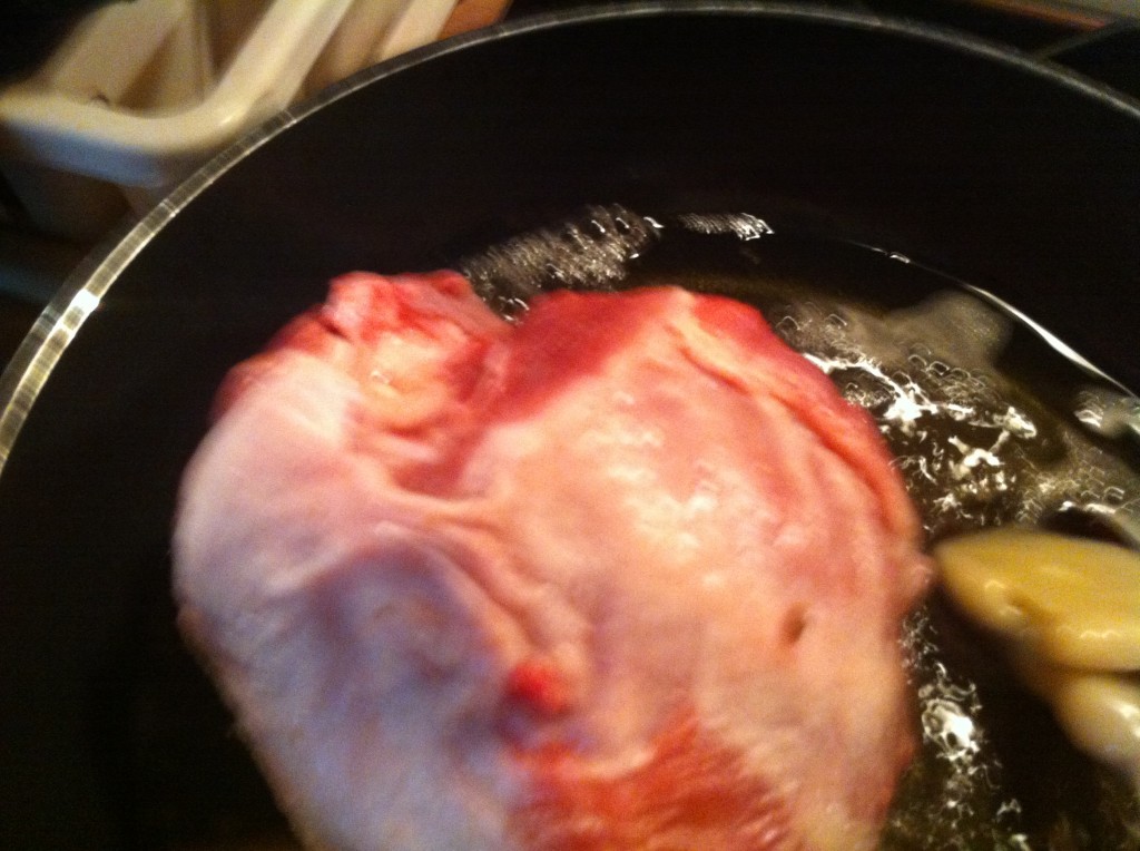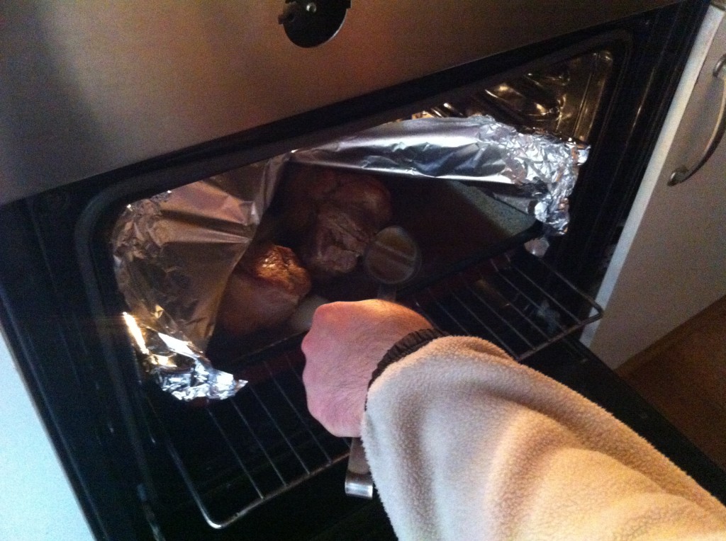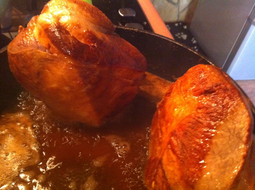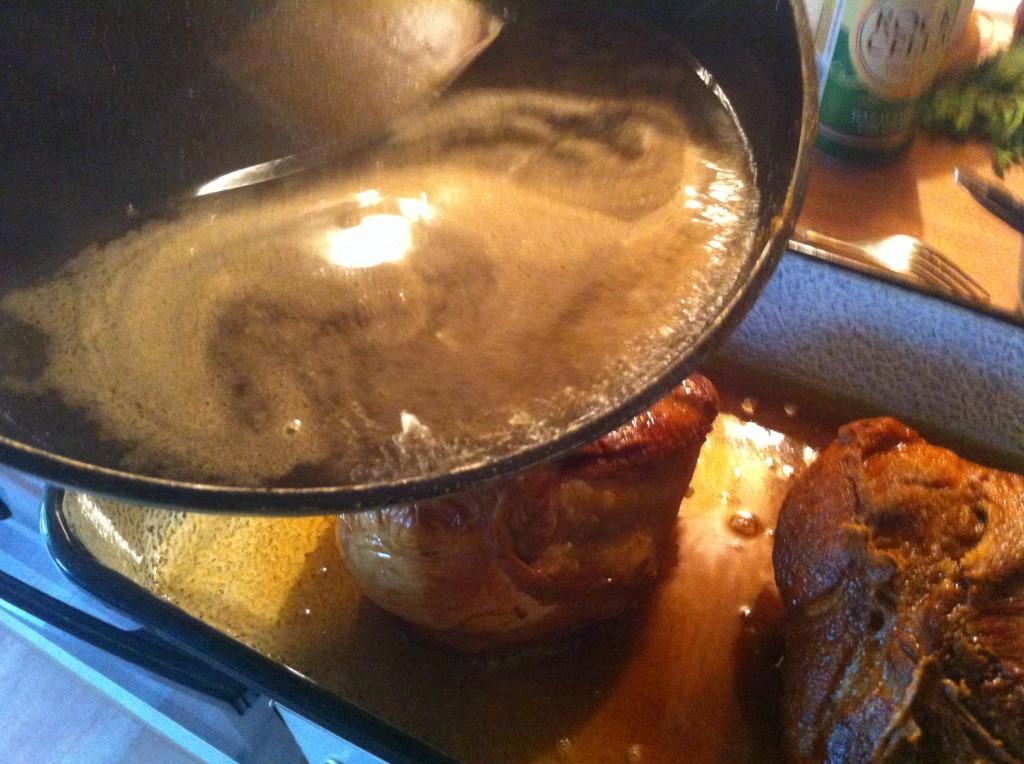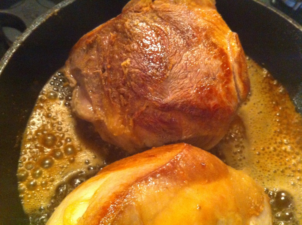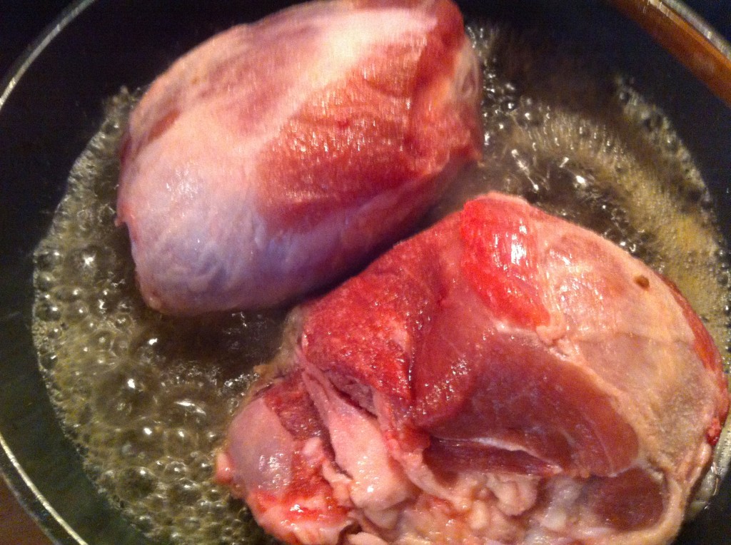 A csontot felrakom kislángon hideg vízbe főni. Amíg melegszik a víz, addig a zöldségeket megpucolom és vízbe teszem. A combokat jól bdörzsölöm sóval (ha még nem tettük meg) és forró zsírban kérgesre pirítom körbe. Ha szép piros mindenhol, beleteszem a tepsibe, ráöntöm a serpenyőből a zsírt. A serpenyőbe ezután engedek még vizet (kb. 2-2.5 dl) és kiöblítem a húsra a maradék sós-vizes-zsíros lét. (Figyeljünk oda, ha túl forró a serpenyő a víz+ forró zsír találkozása balesetveszélyes, ha meg túl hideg, akkor nem fogjuk rendesen kiöblíteni. Ilyenkor -ha nagyon lehűlt- nyugodtan tegyük vissza a tűzhelyre és forraljuk egy kicsit meg.). Beledobok pár szem pucolt, egész hagymát, lefedem alufóliával és mehet is be a 180-200 fokos sütőbe.