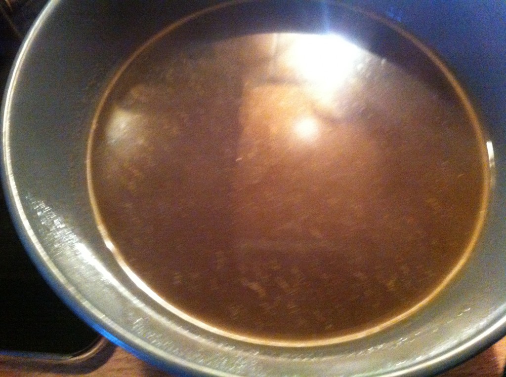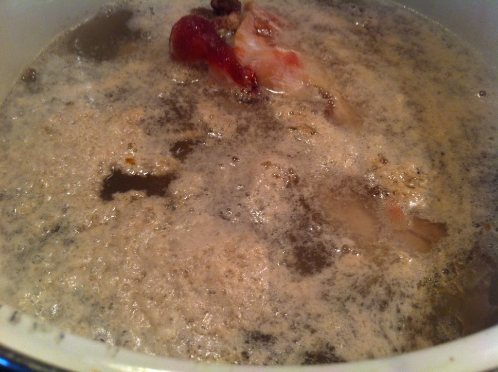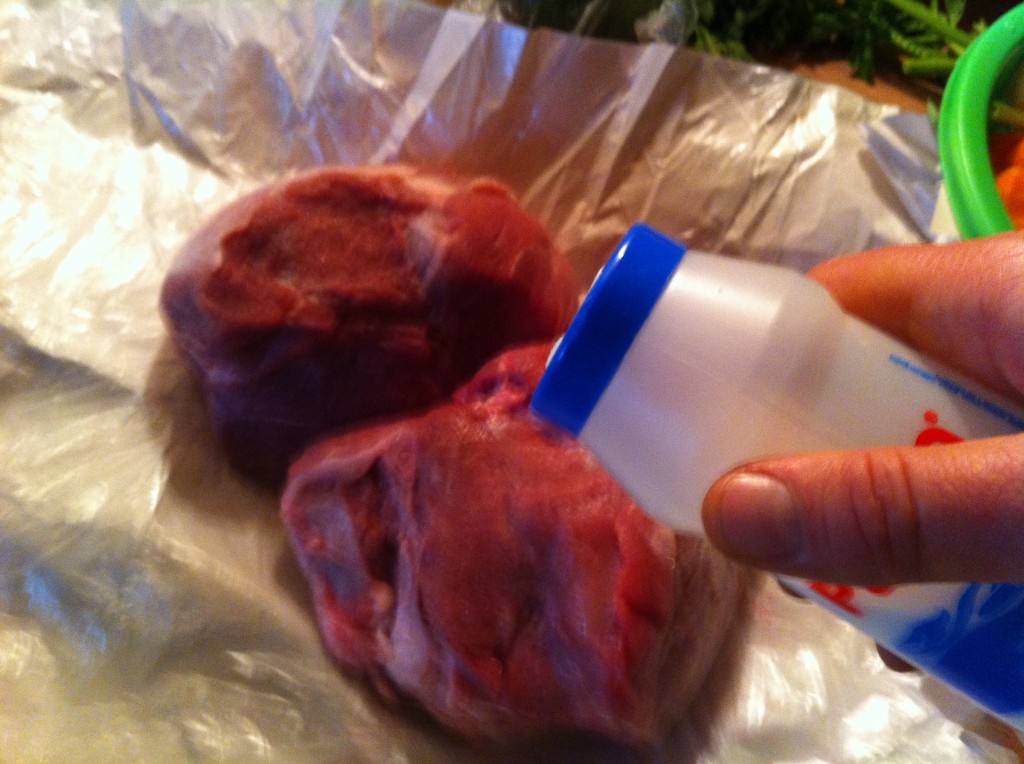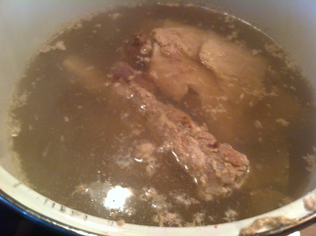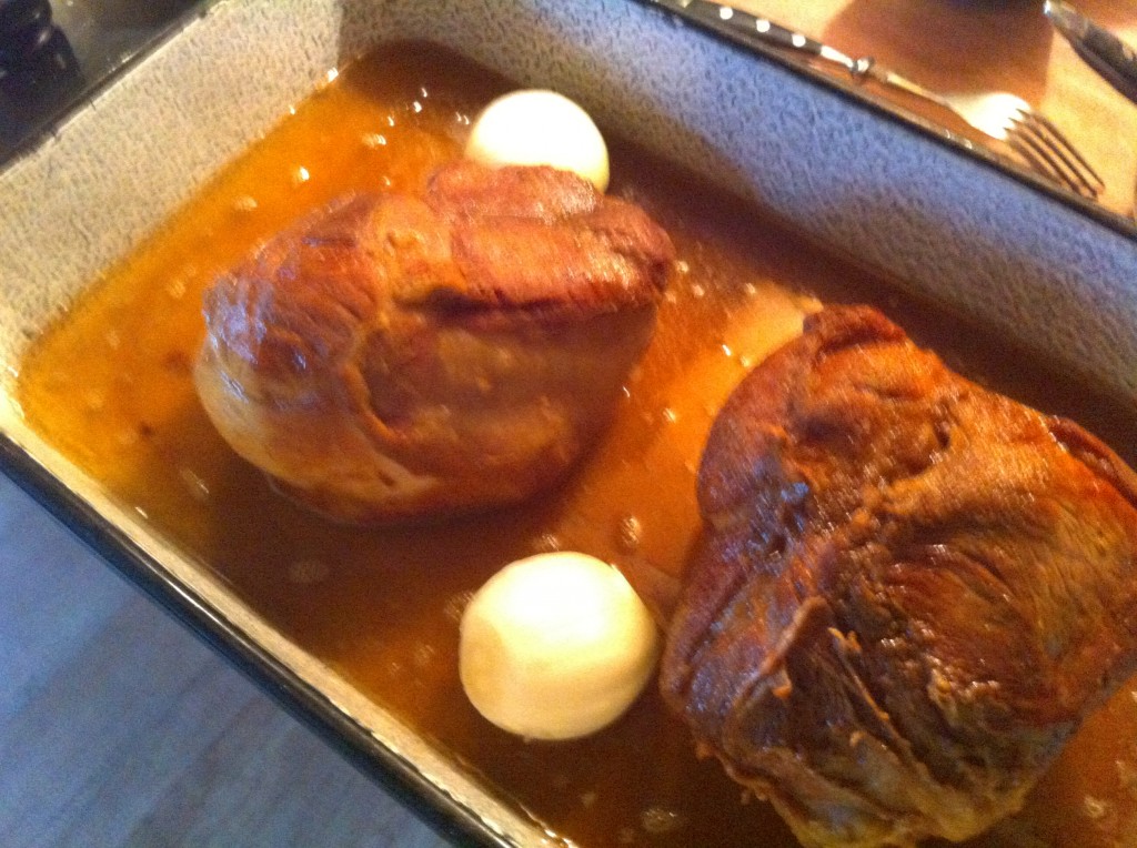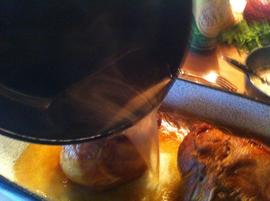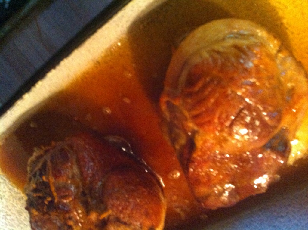 A csontot felrakom kislángon hideg vízbe főni. Amíg melegszik a víz, addig a zöldségeket megpucolom és vízbe teszem. A combokat jól bdörzsölöm sóval (ha még nem tettük meg) és forró zsírban kérgesre pirítom körbe. Ha szép piros mindenhol, beleteszem a tepsibe, ráöntöm a serpenyőből a zsírt. A serpenyőbe ezután engedek még vizet (kb. 2-2.5 dl) és kiöblítem a húsra a maradék sós-vizes-zsíros lét. (Figyeljünk oda, ha túl forró a serpenyő a víz+ forró zsír találkozása balesetveszélyes, ha meg túl hideg, akkor nem fogjuk rendesen kiöblíteni. Ilyenkor -ha nagyon lehűlt- nyugodtan tegyük vissza a tűzhelyre és forraljuk egy kicsit meg.). Beledobok pár szem pucolt, egész hagymát, lefedem alufóliával és mehet is be a 180-200 fokos sütőbe.