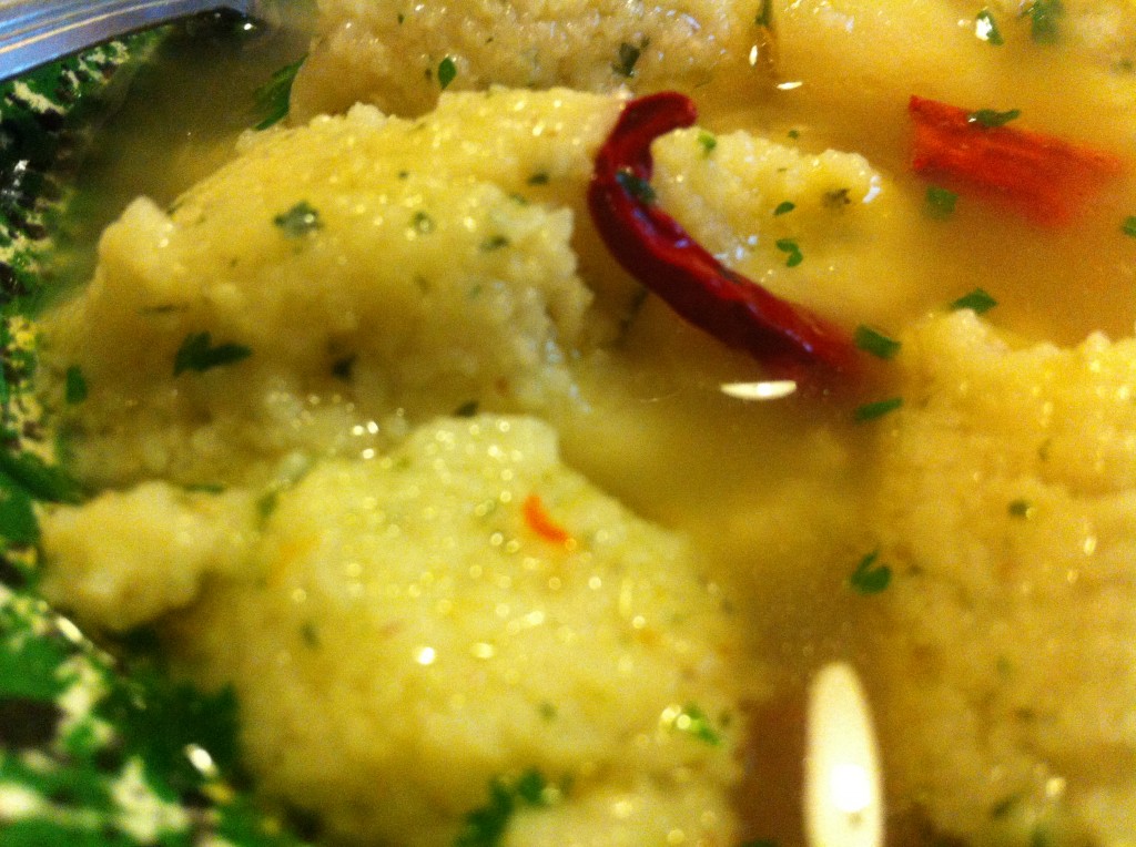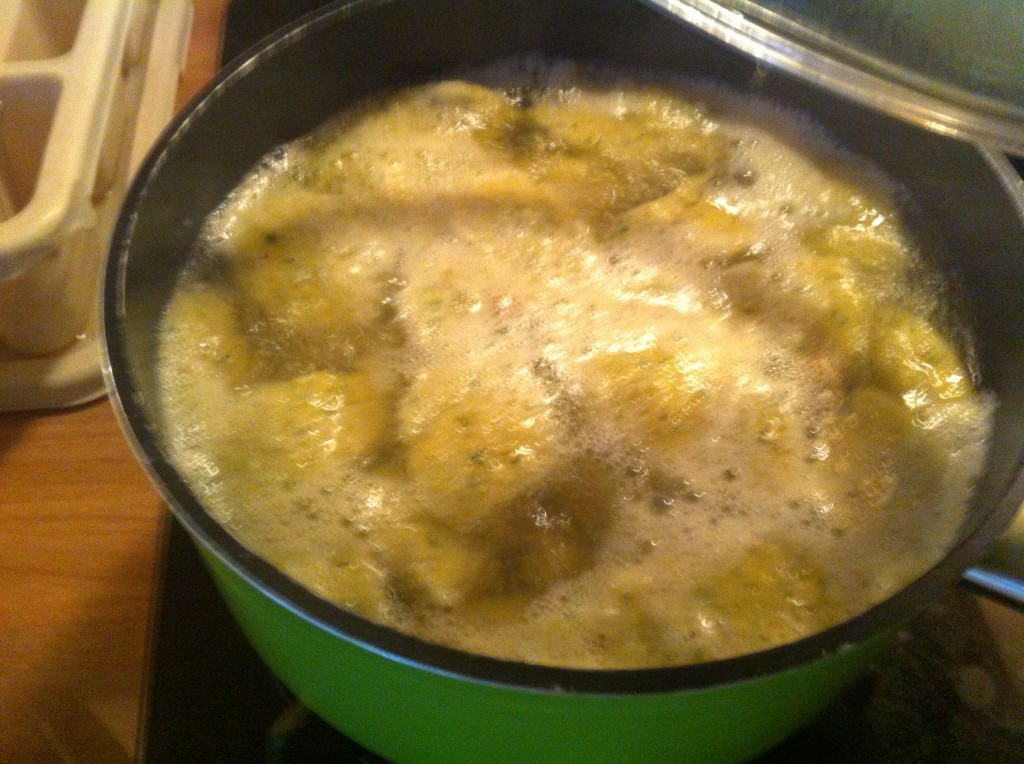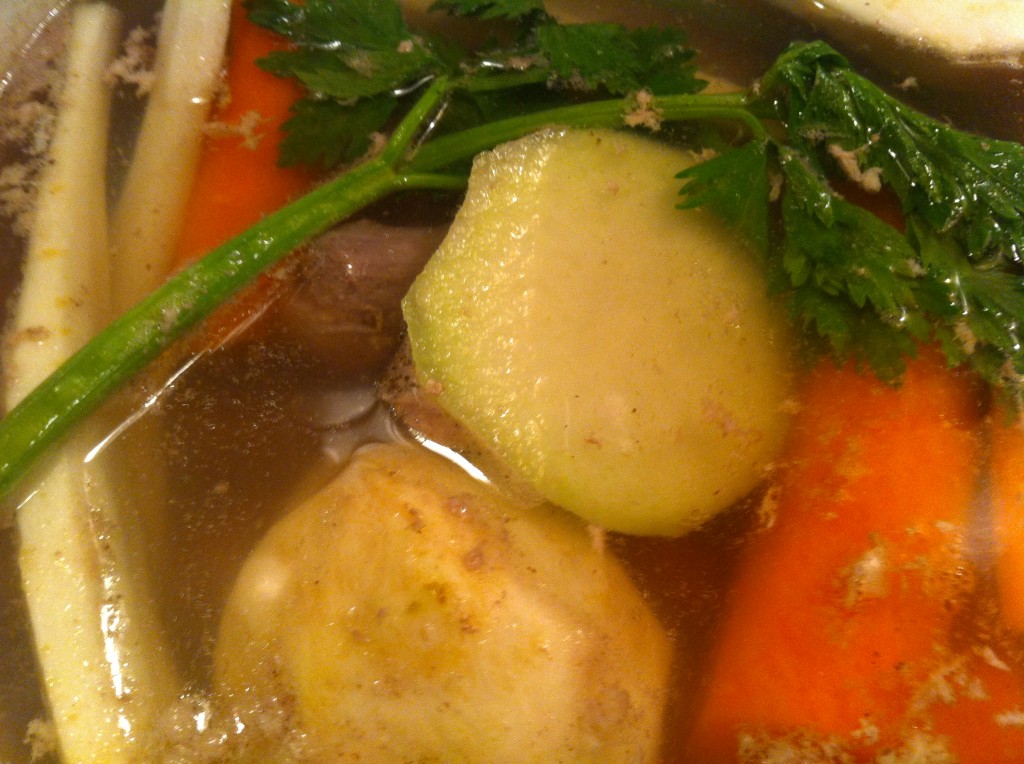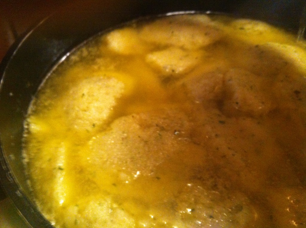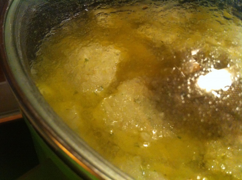 Közben, ha felhabzik a csontlé, lehabozom reszelek bele szerecsendiót, és beleteszem a zöldségeket, sózom és hagyom kislángon lassan főni. A grízt villával összekeverem/nyomkodom a zsírral, sóval és petrezselyem zölddel. (Ha valaki szereti, mehet bele őrölt feketebors is.) Ráütök két egész tojást, és ezzel is jól összekeverem/nyomkodom. Ha kicsit híg lesz, akkor sem kell megijedni. Mehet a hűtőbe egy fél órára.