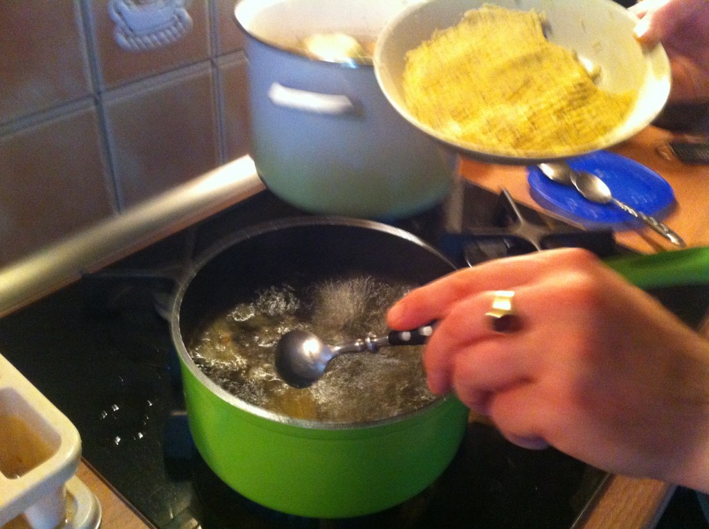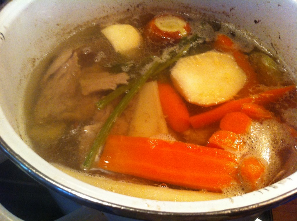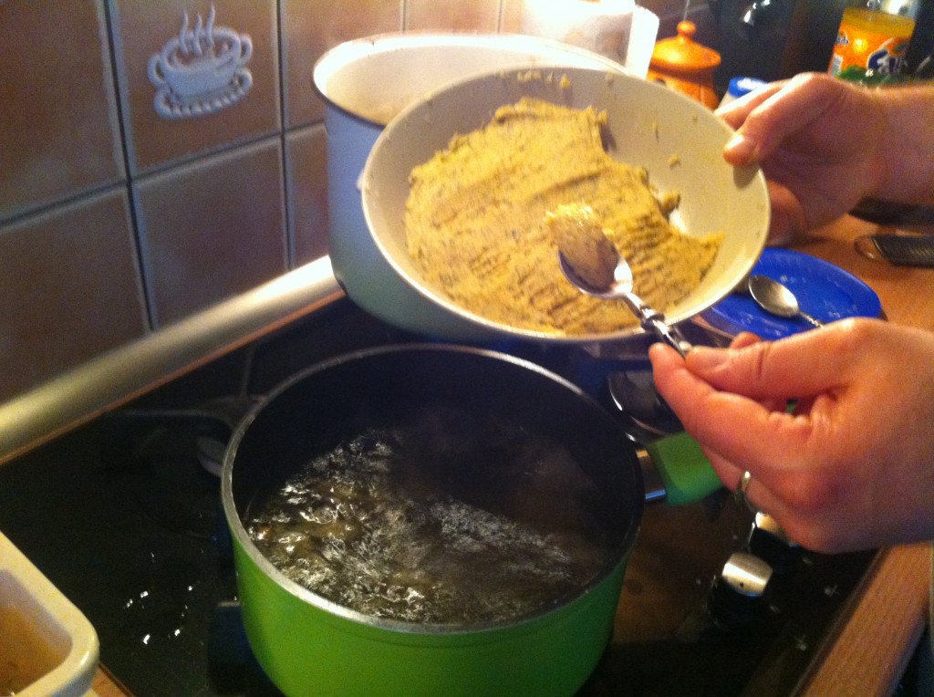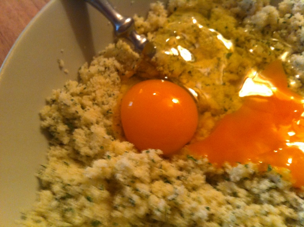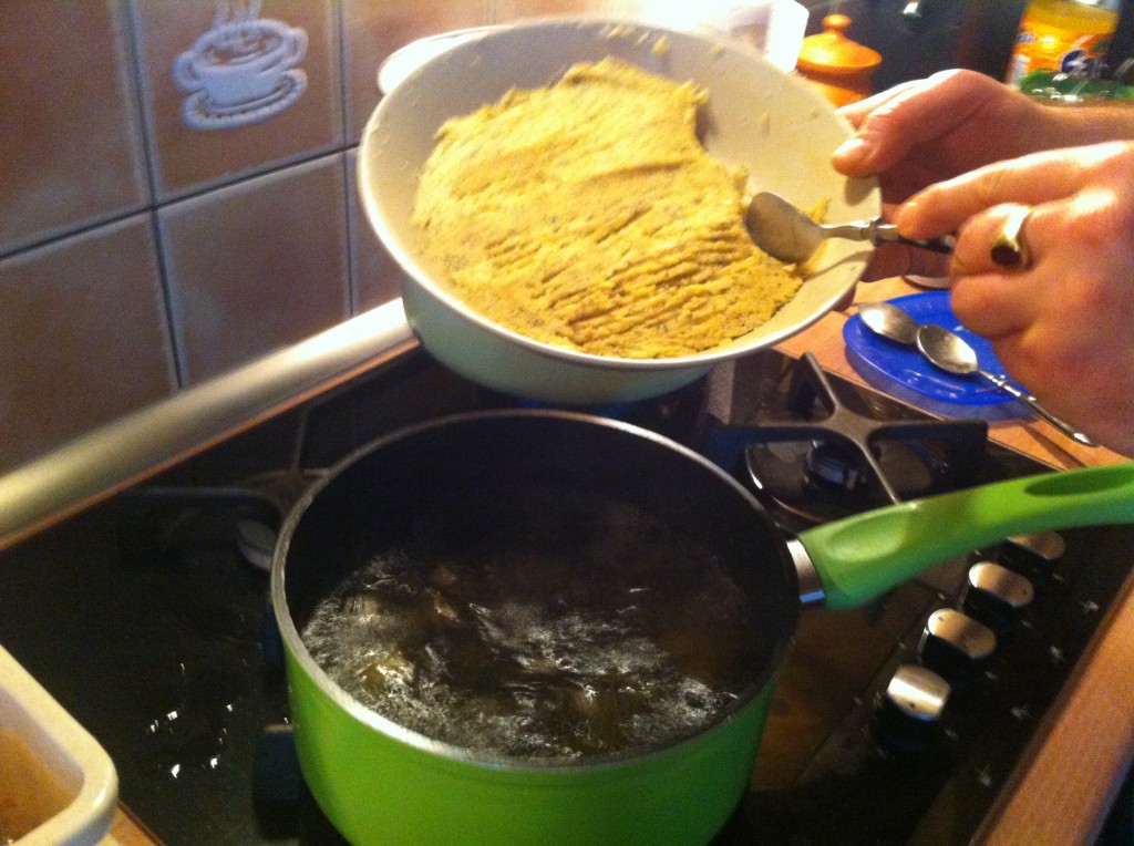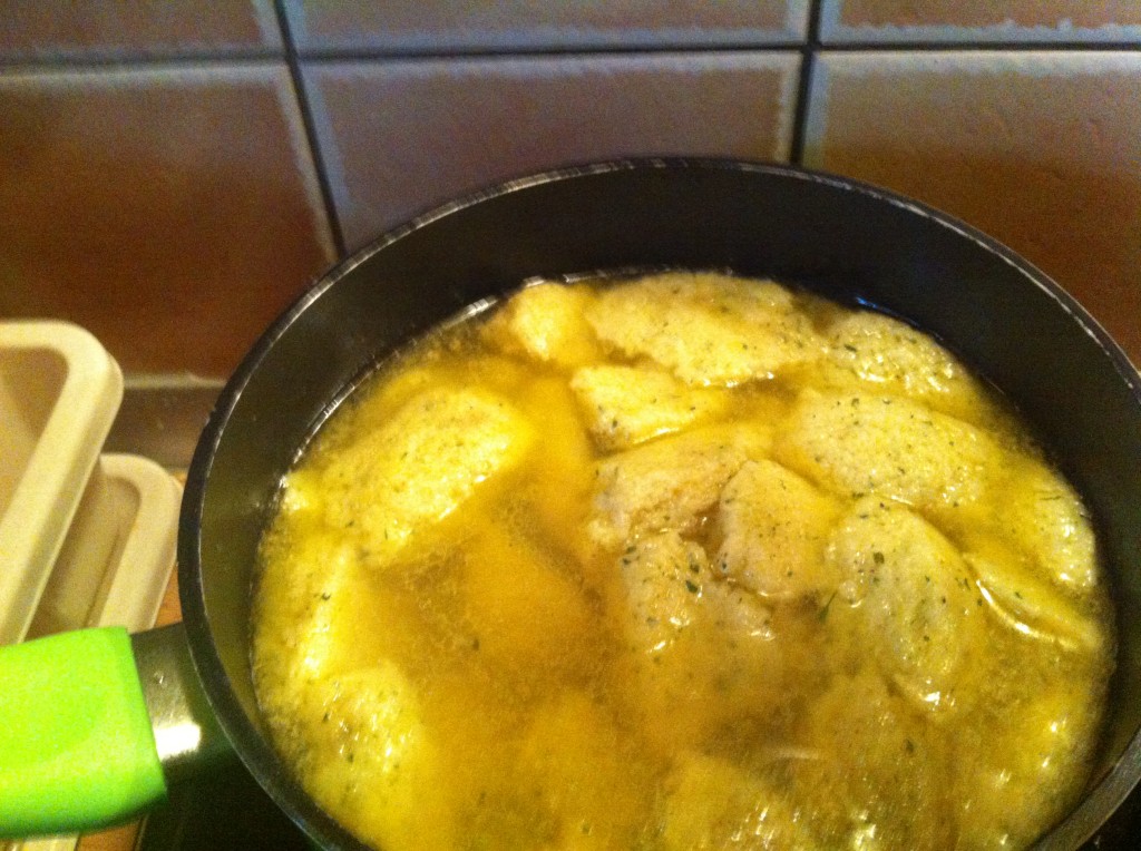 Közben, ha felhabzik a csontlé, lehabozom reszelek bele szerecsendiót, és beleteszem a zöldségeket, sózom és hagyom kislángon lassan főni. A grízt villával összekeverem/nyomkodom a zsírral, sóval és petrezselyem zölddel. (Ha valaki szereti, mehet bele őrölt feketebors is.) Ráütök két egész tojást, és ezzel is jól összekeverem/nyomkodom. Ha kicsit híg lesz, akkor sem kell megijedni. Mehet a hűtőbe egy fél órára.