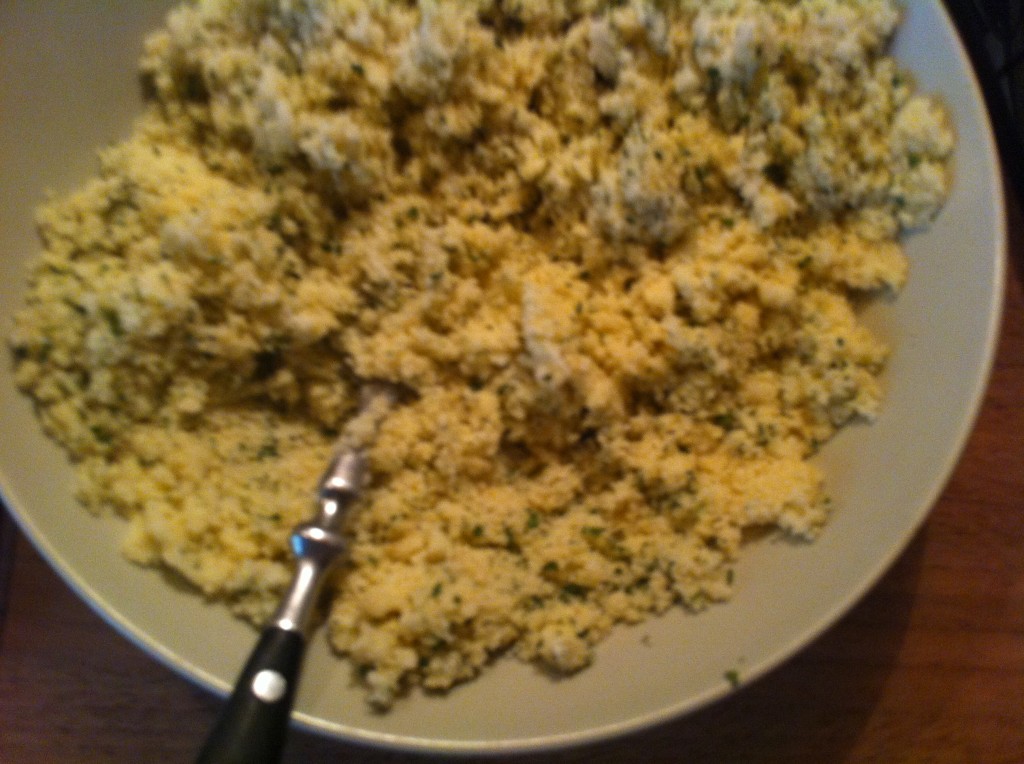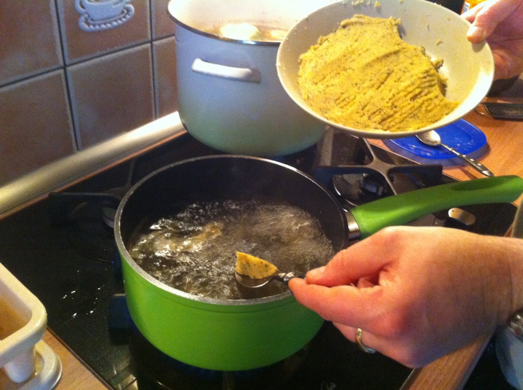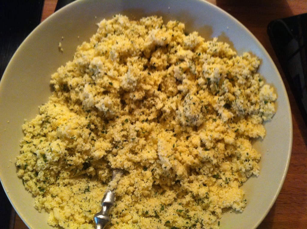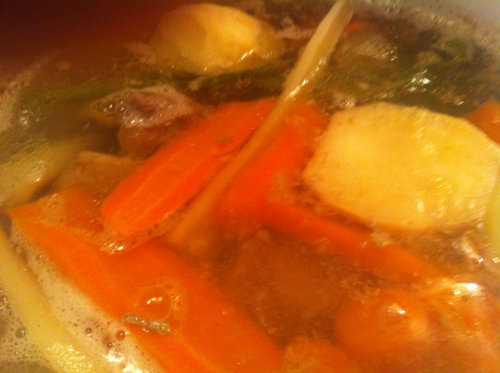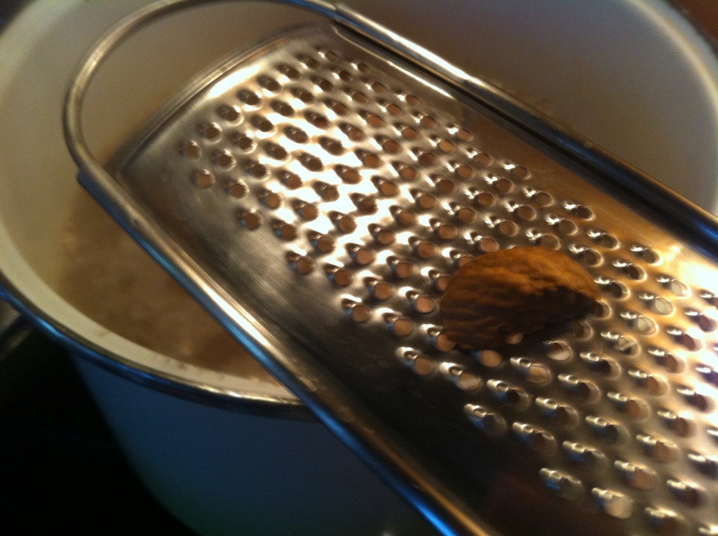 Közben, ha felhabzik a csontlé, lehabozom reszelek bele szerecsendiót, és beleteszem a zöldségeket, sózom és hagyom kislángon lassan főni. A grízt villával összekeverem/nyomkodom a zsírral, sóval és petrezselyem zölddel. (Ha valaki szereti, mehet bele őrölt feketebors is.) Ráütök két egész tojást, és ezzel is jól összekeverem/nyomkodom. Ha kicsit híg lesz, akkor sem kell megijedni. Mehet a hűtőbe egy fél órára.