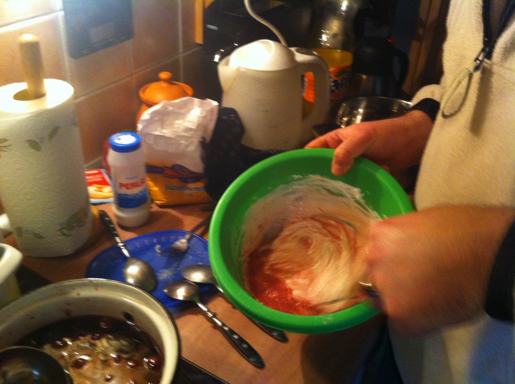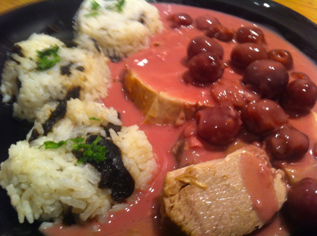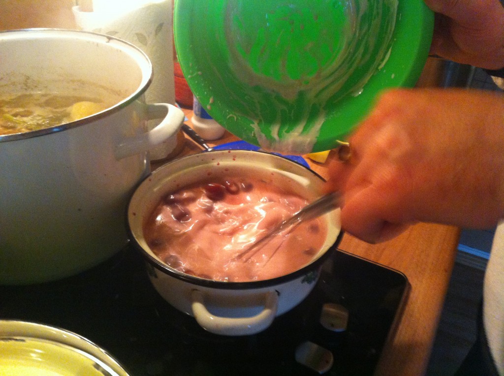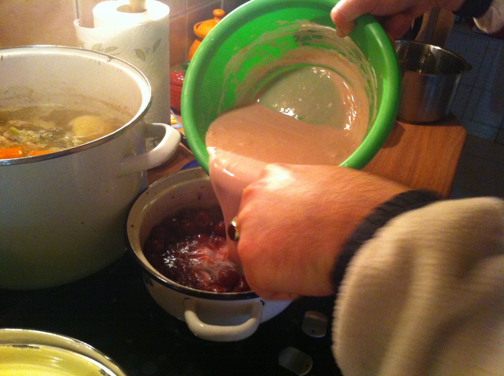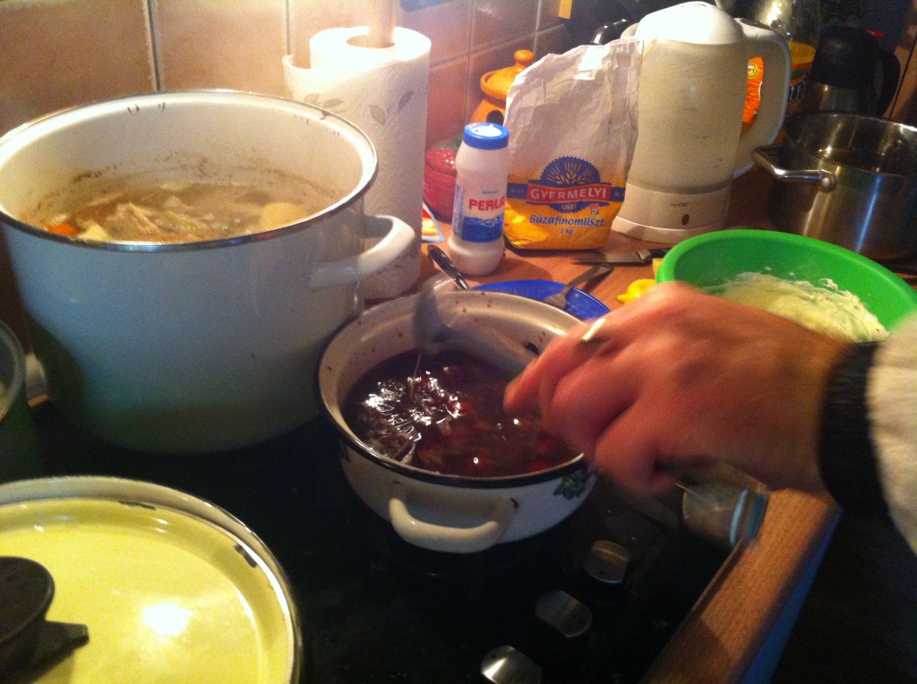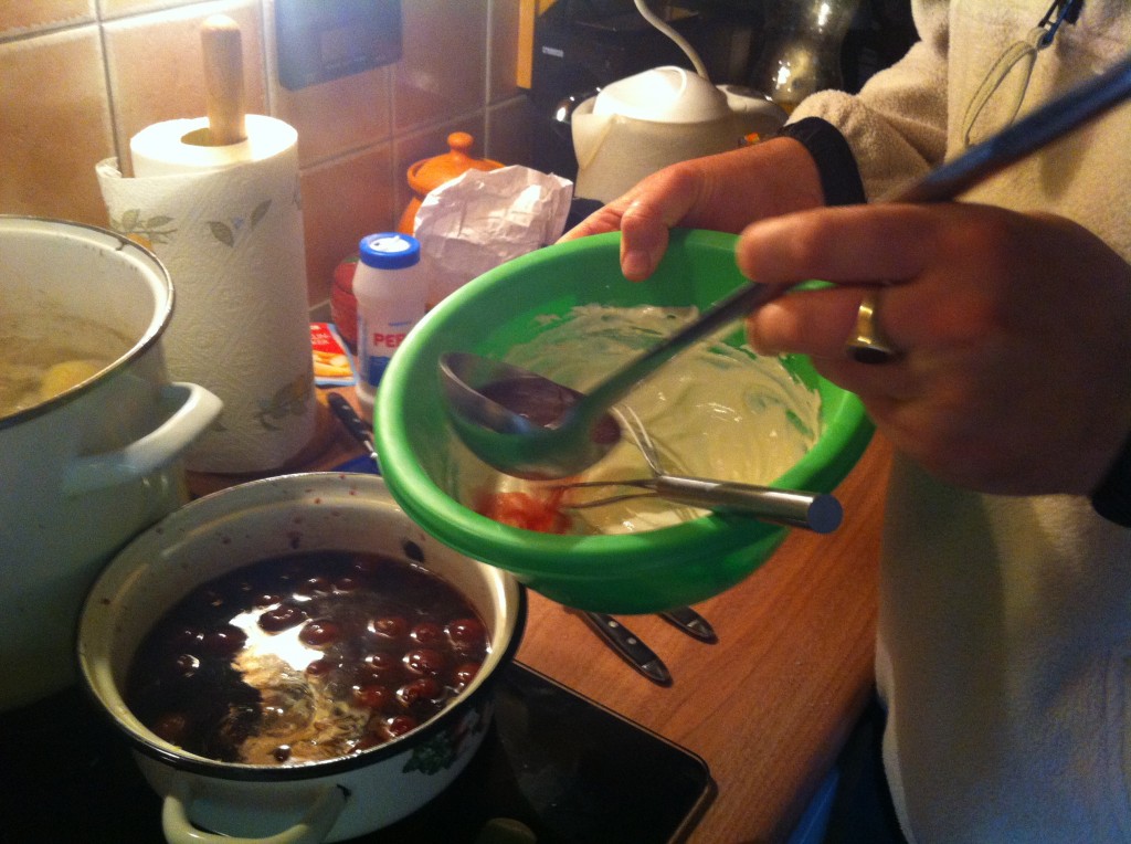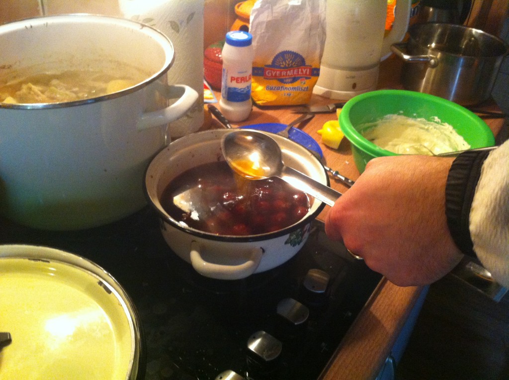 Ezután felrakok 1.5-2 dl vizet a fahéjjal, szegfűszeggel, szegfűborssal főni. Pár percig főzöm, leszűröm. A magozott megybefőttet felforralom, hozzáöntöm a leszűrt fűszeres levet (érdemes kóstolni, nem biztos, hogy mind kell). Mehet bele egy csipet só, cukor -ízlés szerint- majd a sülő hús szaftjából 1-2 spicckanálnyi. (Ha még nincs kész a hús vagy még túl vizes a szaft, akkor ezt a legvégén is hozzáadhatjuk.) Ha nem elég savanykás, egy kis citromlével ezt orvosolhatjuk. A tejfölt kikeverjük a lisztel simára, a forró meggyes léből fokozatosan átmerünk (ilyenkor célszerű takarékra tenni vagy lekapcsolnia tűzhelyet a meggyszósz alatt!) a tejfölös keverékre és kikeverjük (hőkiegyenlítés, hogy ne csapódjon ki a tejföl). Ha már elég meleg a tejfölös keverékünk, hozzáöntjük a meggyszószhoz és elkeverjük. Ezután kiforraljuk folyamatos kevergetés mellett. Be kell szépen sűrűsödnie. Kóstuljuk és utání zesítjük - ha kell.