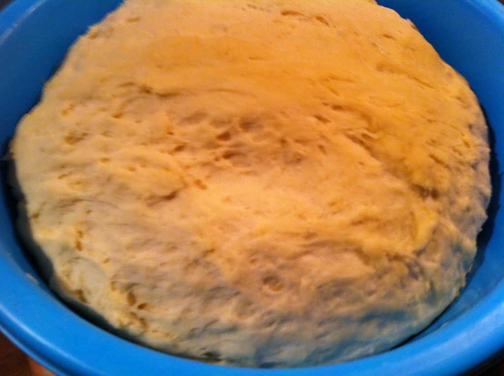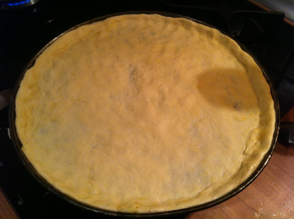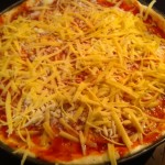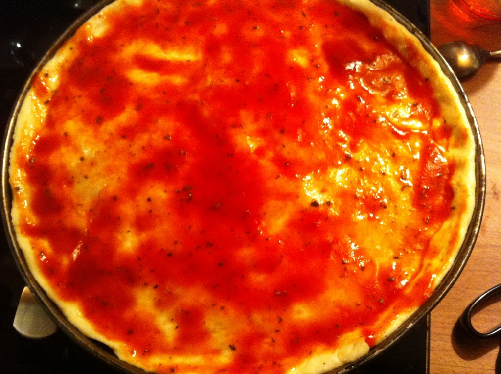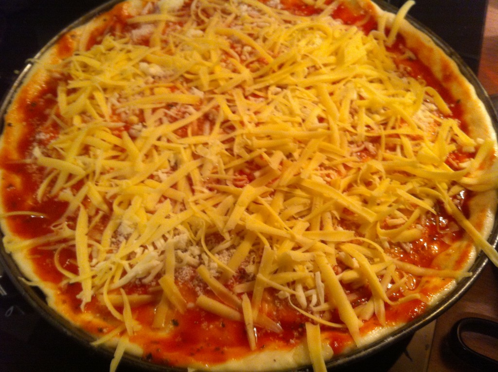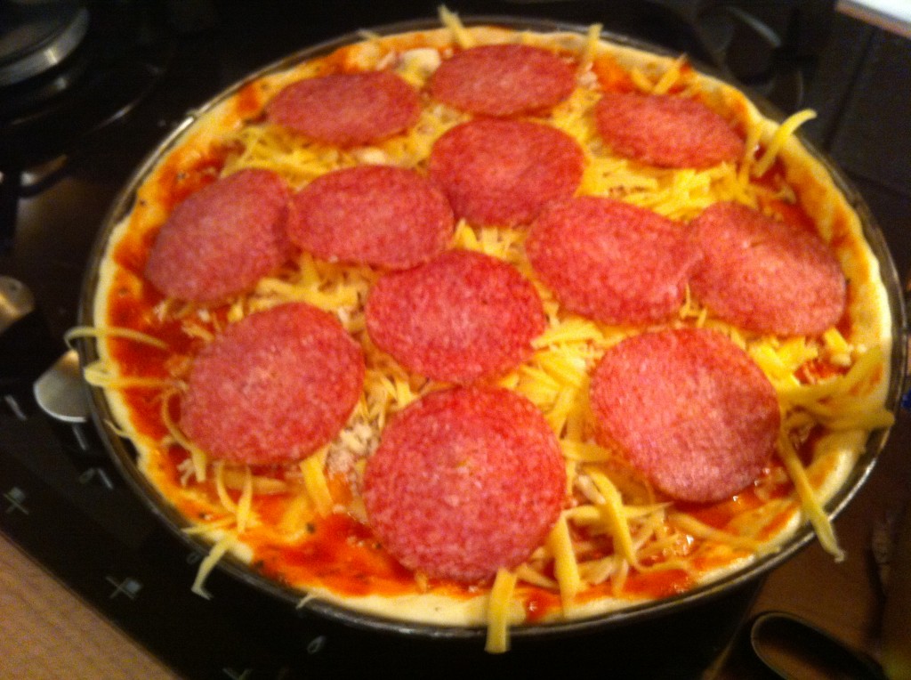 Az élesztőt felfutattjuk egy kevés tejben, cukorral, a lisztet szárazon összekeverjük a sóval (esetleg mehet bele szárított oregánó is, én most kihagytam). Ha az élesztő felfutott összekeverjük a liszttel, és folyamatosan langyos vizet adunk hozzá, amíg egy közepesen lágy tésztát ne kapunk. Ekkor adunk hozzá olívaolajat is, és jól összedolgozzuk. Meleg helyen pihentetjük és többször átgyúrjuk (Ha van dagasztógépünk még egyszerűbb a dolgunk.) Amíg kel, előkészítjük a hozzávalókat. A pardicsomlevet enyhén fűszerezzük (elhagyható), a sonkát, szalámit előkészítjük (ha kell szeleteljük, felvágjuk), a sajtokat lereszeljük (természetesen lágyabb sajtokat nem - gorgonzola, kéksajtok). Ha már kb a kétszeresére megkelt a tészta, kiveszünk egy maroknyit és a formába nyújtjuk (egy kis olívaolaj mehet a formába vagy a kezünkre, könnyebben fogun k dolgozni és a tészta sem fog ragadni a kezünkhöz). A vastagság ízlés kérdése, mi a vékony tésztát részesítjük előnybe. Megkenjük a tetejét paradicsommal, majd jönnek a sajtok. (Figyelem! A sajt a pizzán a feltétek legaljára kerül! Ha a tetejére tesszük, akkor a többi feltét megfő és egy gyenge minőségű melegszendvics-szerűséget kapunk.) Én úgy szoktam, hogy a paradicsomszószos tésztára szórok egy kevés parmezánt, arra mehet a mozarella, majd esetlegesen a többi sajt ha van (kéksajtok kivételek!). Ha ez rajta van, akkor teszem rá a sonkát, hagymát, szalámit, kukoricát, olíva bogyót, kéksajtokat, juhtúrót, stb. A feltéteknek csak a fantázia szab határt. A látvány kedvéért szoktam pár "szál" sajtot a tetjére is rádobálni/reszelni (képek).