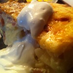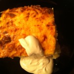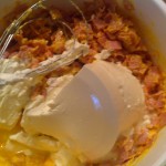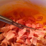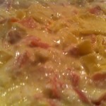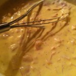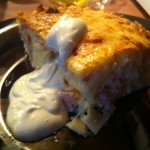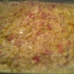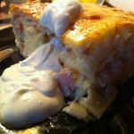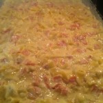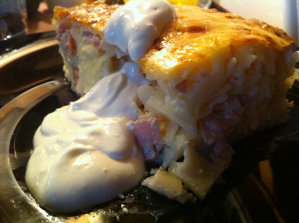 A tésztát feltesszük főni, amíg fő a vajat krémesre keverjük a tojás sárgájával, a fehérjéből keményhabot verünk. A krémhez adjuk a tejfölt és a sonkát (füstöltnél figyeljünk mennyire sós a sonka!), sózzuk, borsozzuk, majd finoman hozzá keverjük a felvert fehértjét (vigyázzunk, ne törjük össze!). Ezt összekeverjük még a tésztával is finoman. (Ne spóroljunk a krémmel, mert a tészta nagyon beszívja és száraz lesz! Ha kevésnek ítéljük, inkább a tésztából rakjunk hozzá kevesebbet) A kivajazott tepsibe öntjük. Meghintjük reszelt sajttal és kb 180-200 fokon készre sütjük.