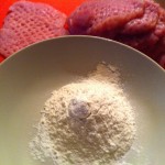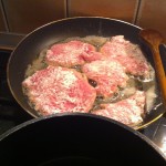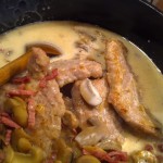 A nokedlit kiszaggatjuk. (Mindig többet csinálok, ilyenkor másnap lehet belőle tojásos nokedli vagy sajtos nokedli). A húst kissé kiklpofoljuk, sózzuk és borsos lisztbe megforgajuk. Zsíron hirtelen megsütjük, majd félretesszük. A visszamardt zsírban a füstölts sonkát és gombát lepirítjuk, sózzuk, borsozzuk. Kevés alaplével vagy vízzel felengedjük és beletesszük a hússzeleteket. Fedő alatt készre pároljuk. Ha puha a hús, felöntjük tejszínnel. Megforraljuk, majd vízzel elkevert keményítővel besűrítjük.