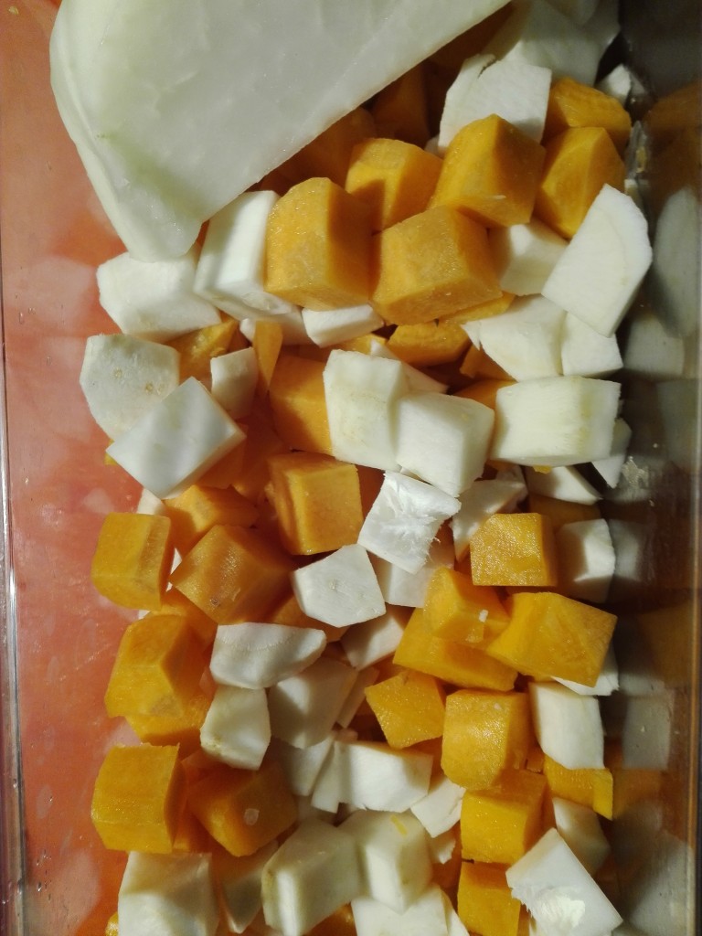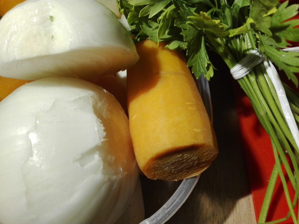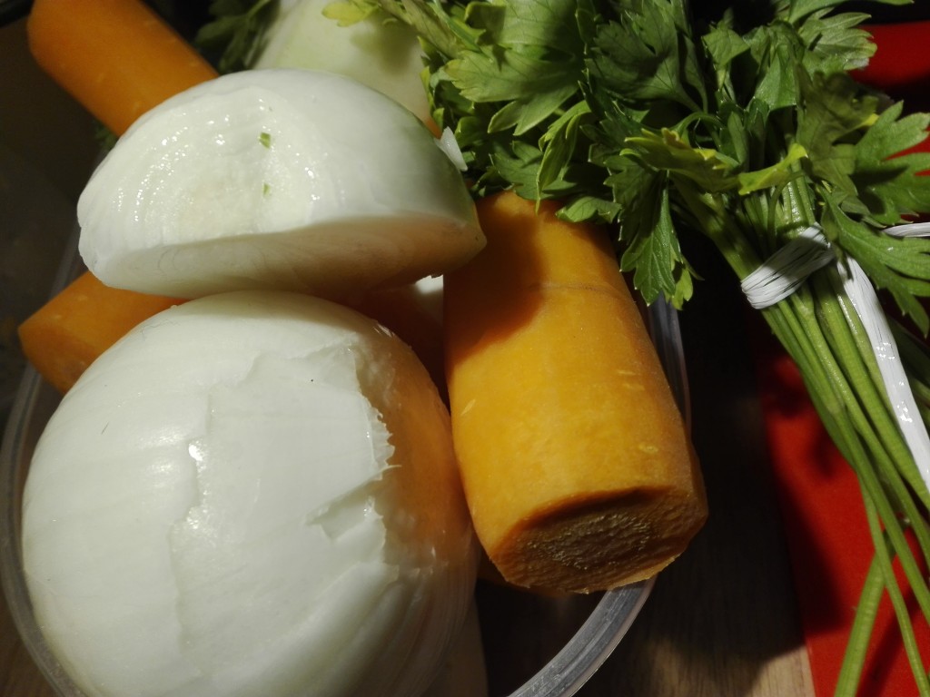 Beletesszük egy jó nagy lábosba és felöntjük vízzel, hogy mindent elepjen (nekem erre úgy 12 liter megy rá) és akár csak egy húslevest lassan főzzük, nem forraljuk. Lehabozzuk. Aztán mehetnek bele a zöldségek, hagyma és 3 gerezd fokhagyma. Célszerű egyben hagyni, tuti átfő :)