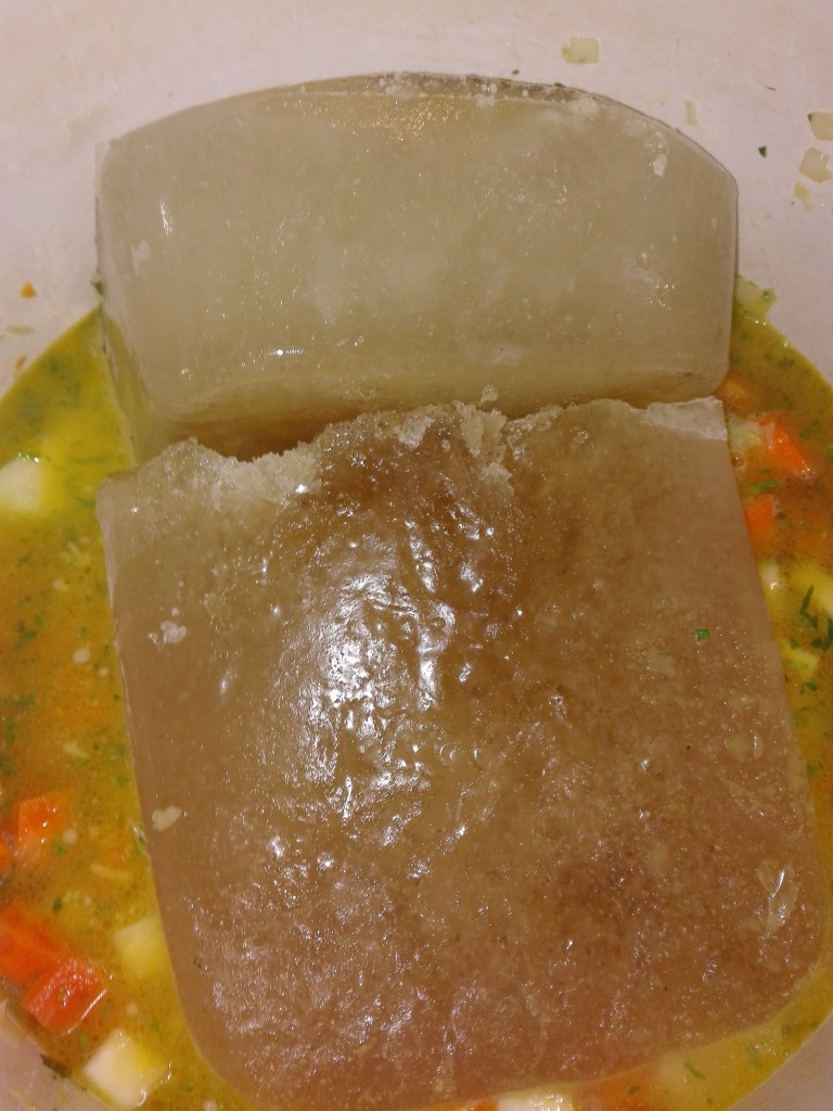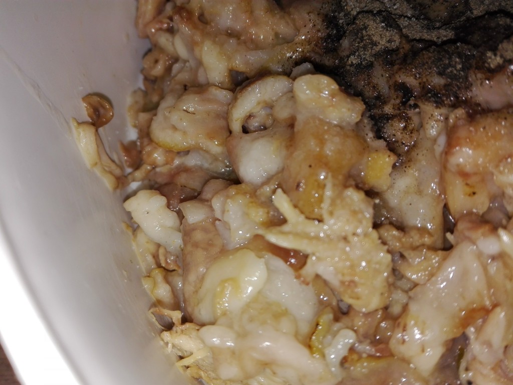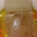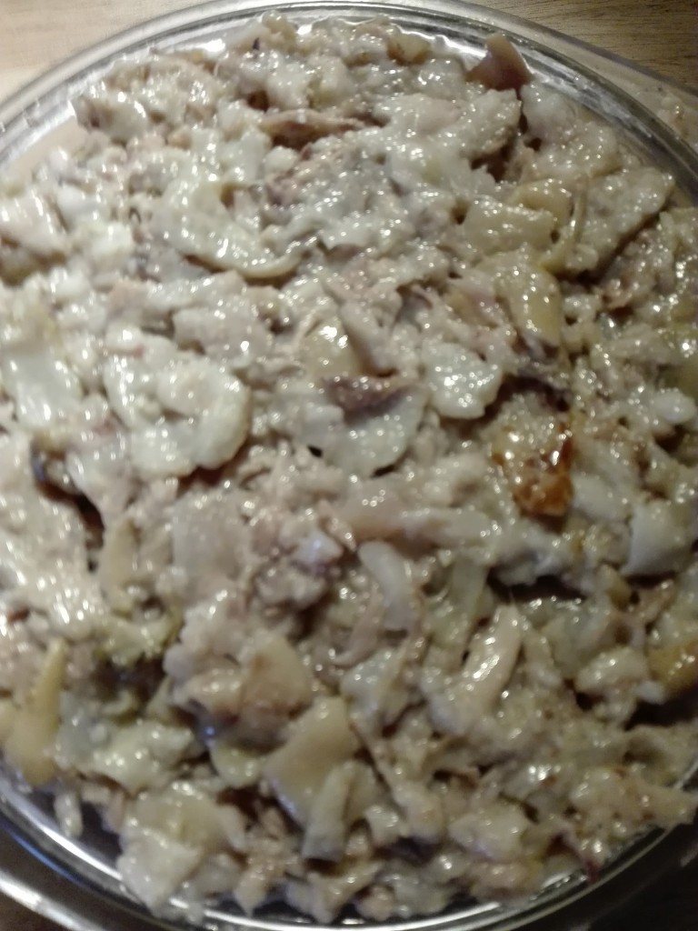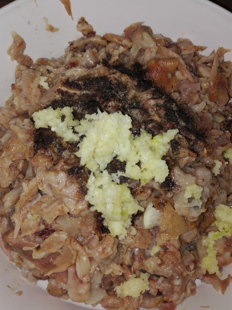 Amikor kész a kocsonya, beleteszem a sovány húsokat (ahogy eddig) és az megy is a hidegre. A körmök, a csülök kövér inas részéből pedig kiszedem a csontokat, majd kézzel nyomkodva (hogy az esetleges csontdarabokat észre vegyem) apró darabokra tépem. Ha van keményebb része, azt is kiteszem (a kutyának). A bőrke is mehet ugyan így bele, ahogy a zsír, szétfőtt ín stb.