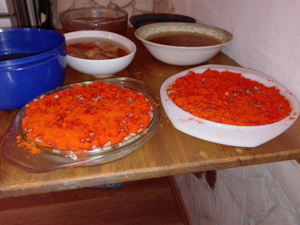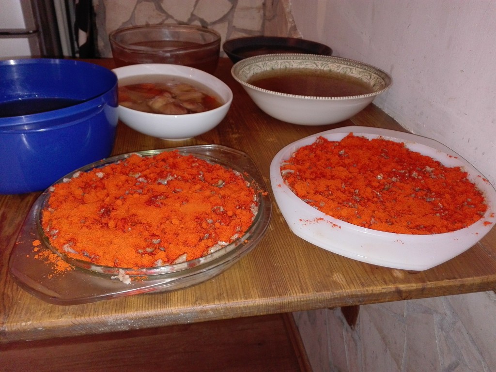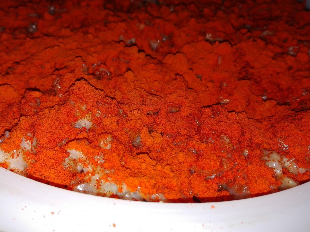 Amikor ez megvan, beborsozom, megsózom, megfokhagymázom és beleteszem egy laposabb tálba. Azután leszórom pirospaprikával (ez úgy fog kinézni, mint az abált szalonna, és a disznósajtra hasonlít állagra).