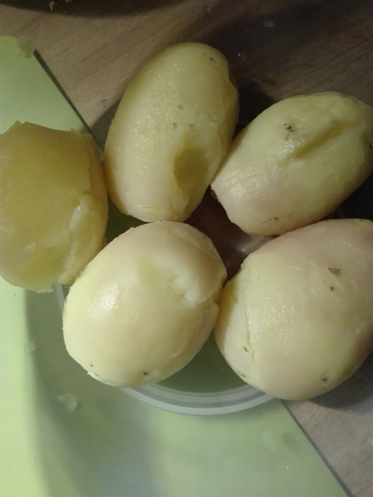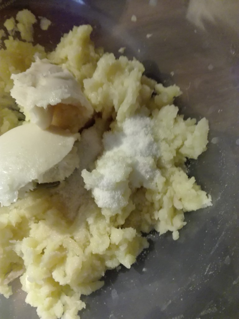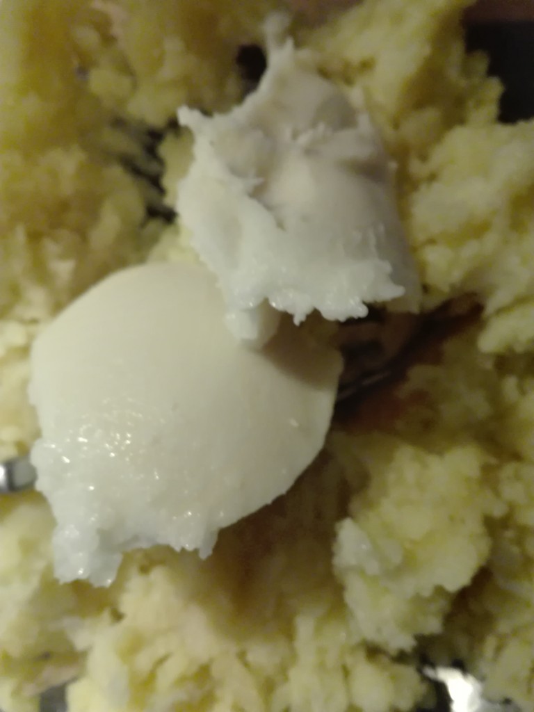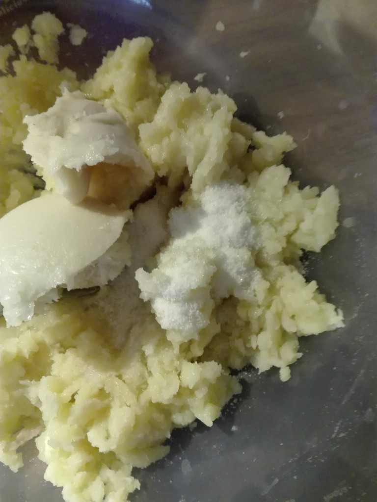 Héjjában megfőzzük a krumplit, lehűtjük, meghámozzuk és villával összetörjük (a legjobb a kifli krumpli, sajnos most olyat nem kaptam). Hozzáadjuk a zsírt és a sót és tovább dolgozzuk, lehetőleg minél egyneműbb legyen.