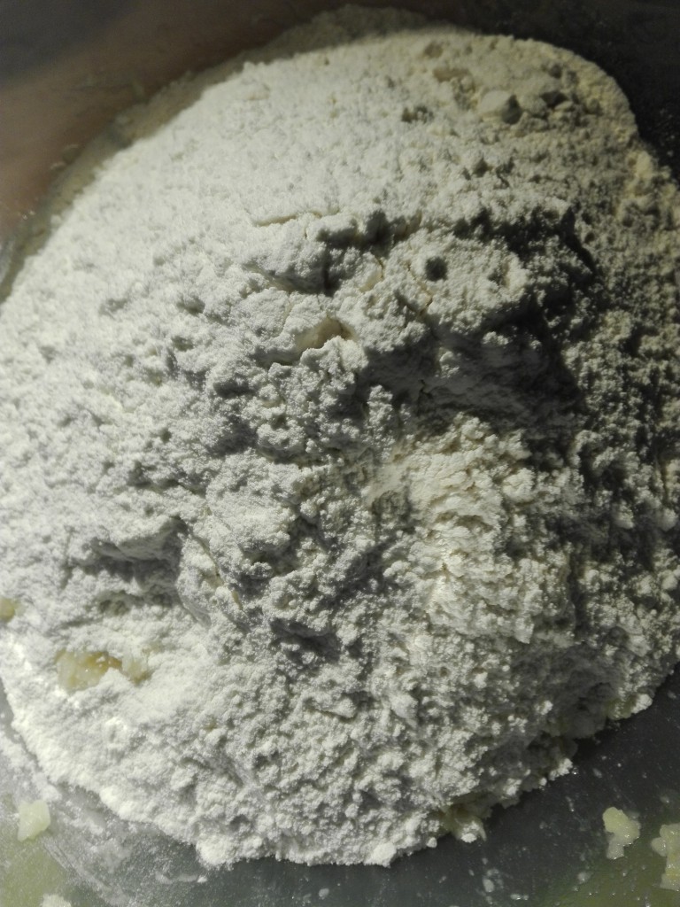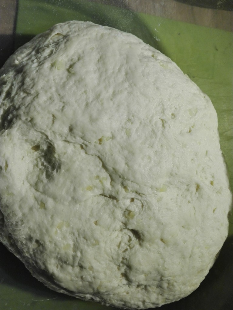 Az élesztőt a cukros tejben felfuttatjuk. A lisztből kb. 85-90 dkg-ot hozzáöntünk a krumplimasszához és kézzel összedolgozzuk.