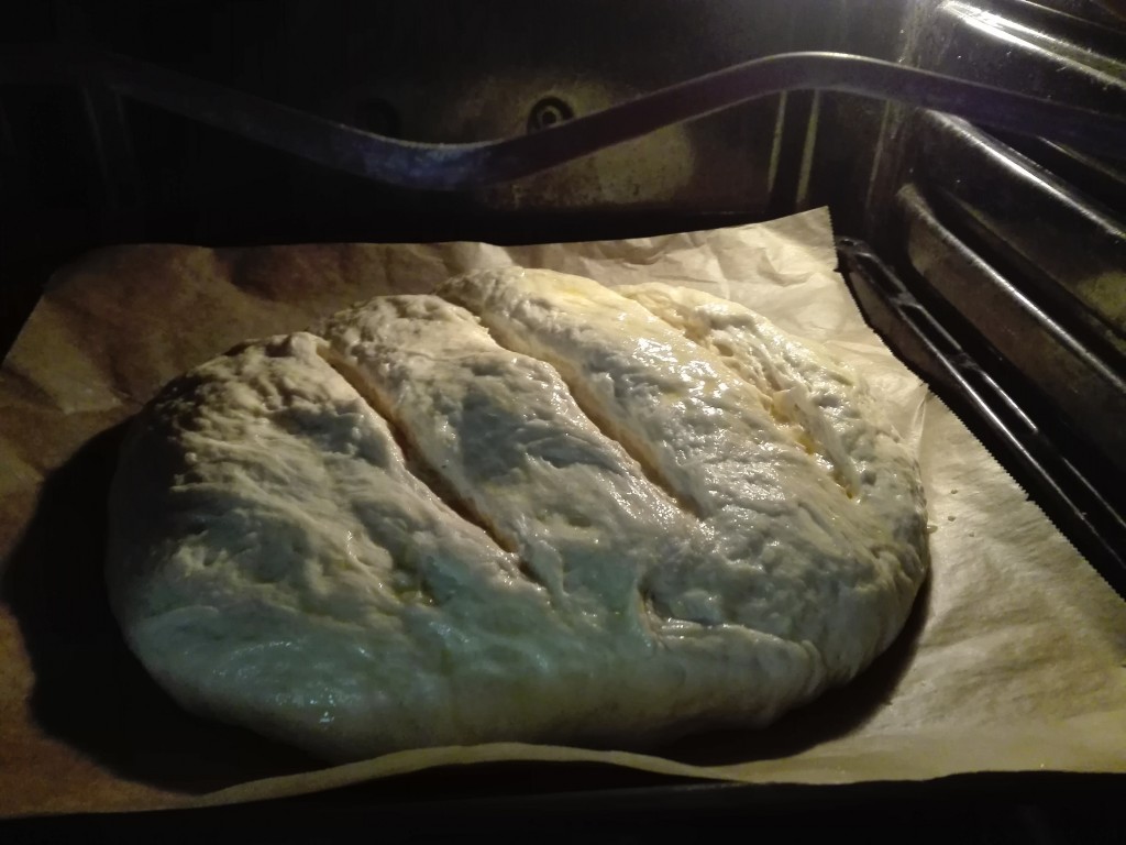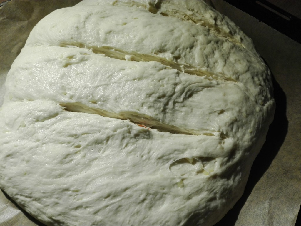 Ha a tészta ismét megdagadt finoman sütőpapírral bélelt tepsibe fordítjuk (nem nyomkodjuk össze!).