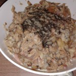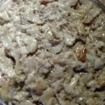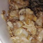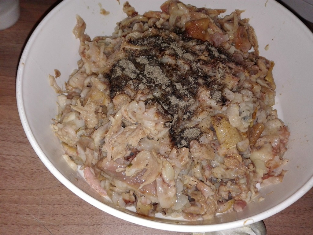 Amikor kész a kocsonya, beleteszem a sovány húsokat (ahogy eddig) és az megy is a hidegre. A körmök, a csülök kövér inas részéből pedig kiszedem a csontokat, majd kézzel nyomkodva (hogy az esetleges csontdarabokat észre vegyem) apró darabokra tépem. Ha van keményebb része, azt is kiteszem (a kutyának). A bőrke is mehet ugyan így bele, ahogy a zsír, szétfőtt ín stb.